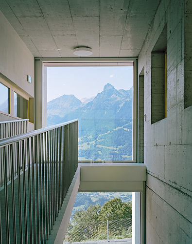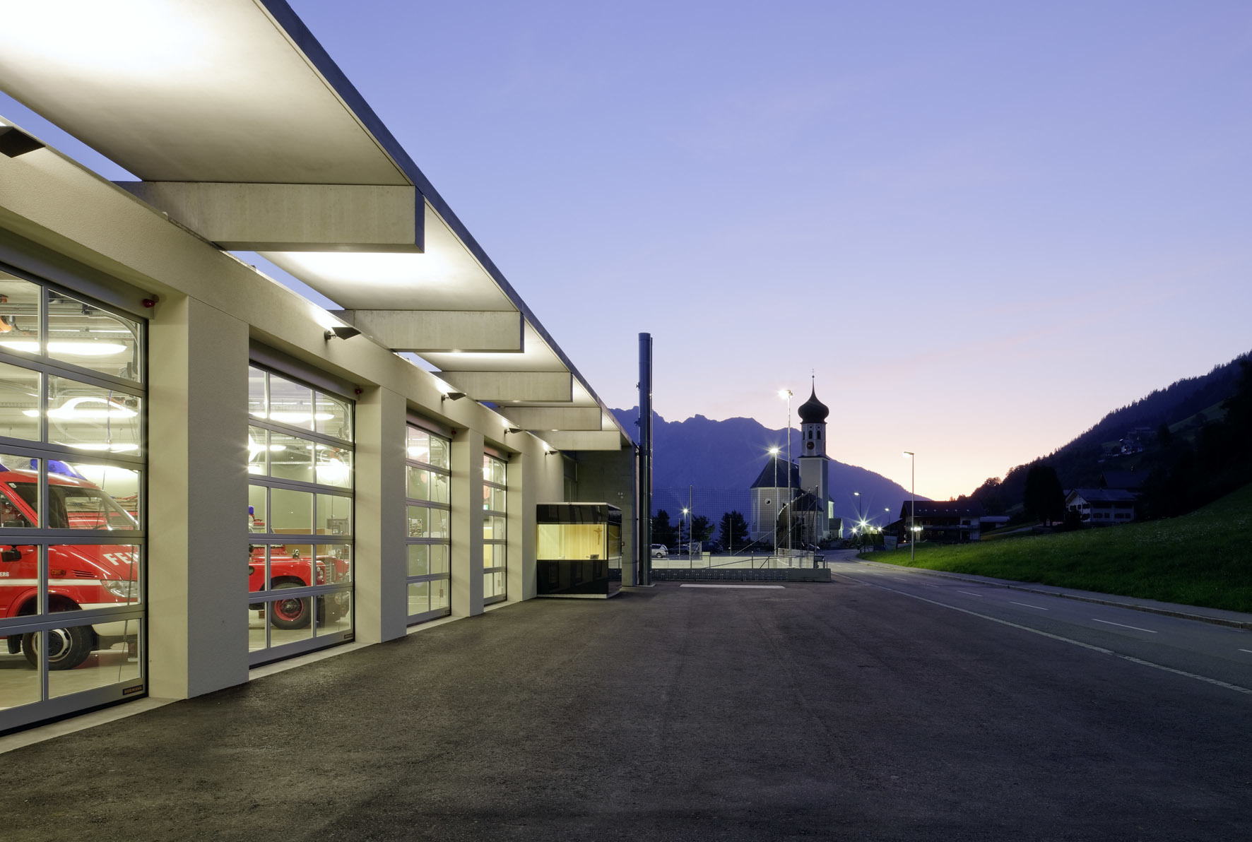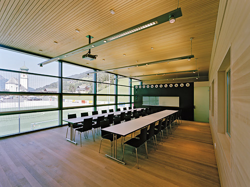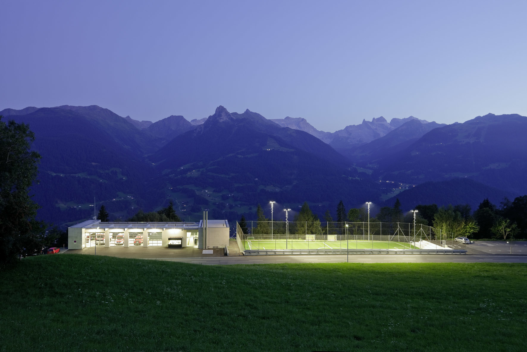 Die kleine Gemeinde im Montafon, in privilegierter sonnseitiger Panoramalage, entwickelt sich der Hangkante entlang. Dominanter Punkt ist die barocke Pfarrkirche. Das Mehrzweckgebäude wird an der Stelle des Feuerwehrhauses errichtet. Das alte Gebäude ist als Torso ins neue integriert. Sehr schlicht schließt der Kubus die Abfolge der Außenräume von Friedhof, Parkplatz, Sportplatz entlang der Straße ab. Auch der Kirchturm bleibt konkurrenzlos: die Gemeinde Bartholomäberg entschloss sich für eine Schlauchwaschanlage. Das Gebäude ist in allen Bereichen barrierefrei betretbar. Die verschiedenen Zugangsebenen erfolgen teils mit Rampen, sodass kein Lift notwendig ist.Das bestehende Feuerwehrhaus wurde um zwei Stellplätze und den westseitigen Anbau erweitert: Versammlungsraum im Erdgeschoss, Vereinslokal für den Fußballclub niveaugleich mit dem Sportplatz, Biomasseheizung im Untergeschoss. Die Mehrfachnutzung ist bis ins Detail ausgereizt, im Planungsprozess wurden alle Nutzer einbezogen. Der Versammlungsraum der Feuerwehr ist gleichzeitig Sitzungszimmer der Gemeinde und bestens geeignet als Veranstaltungsraum. Die Umkleide- und Sanitärbereiche nutzen Sportclub und Feuerwehr ohne Kollision. Auch für die Kinderkrippe ist ein Wickeltisch dort untergebracht. Der Kunstrasenplatz mit dem Spielfeld von 45 x 23 m ist nicht nur dem Fußballclub vorbehalten. Offen für jedermann, durch Flutlichtanlage auch in der Nacht, nutzen ihn Volksschule und Kindergarten zudem zum Turnen. Der Sportplatz, ist um einen Meter abgesenkt. Den hangseitigen Abschluss bildet eine dem Verlauf der Panoramastraße folgende Stützmauer. Der Parkplatz wird mit Infrastruktur ausgestattet, für Festveranstaltungen und Viehmarkt gleichermaßen geeignet. Hochstämmige, neu gepflanzte Bäume begleiten die Straße. (Text: Martina Pfeifer Steiner)