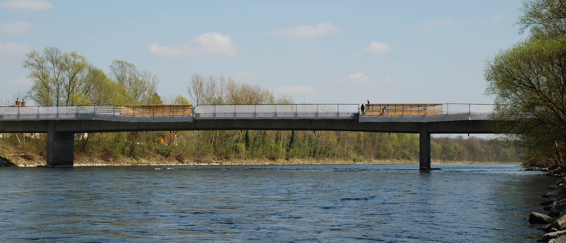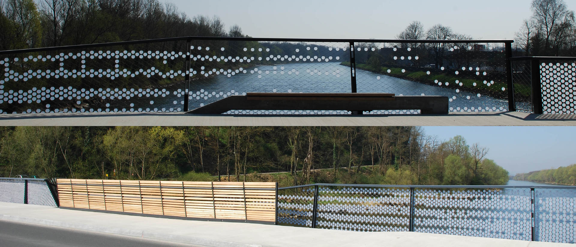 Entsprechend der Exponiertheit des Ortes zwischen den Bewegungsströmen von Straße und Fluss wird das Brückengeländer zum bestimmenden Element. Nur über die elementare Tragstruktur mit dem Bauwerk verbunden, hebt sich die filigrane Geländerfüllung in Form eines Edelstahlseilnetzes von der Brücke ab und legt sich wie ein neues Kleid über das Ingenieurbauwerk. In das Netz eingearbeiteten Rondellen aus transparent schimmerndem Material bewegen sich je nach Windstärke, zeichnen changierende Schattenwürfe auf die helle Betonoberfläche und sorgen für ganz unmittelbare akustische Brückenerfahrungen. Lichtreflexionen auf den Rondellen lassen je nach Sonnen-Einstrahlwinkel das Bild der ehemaligen Grenzbrücke in der Außensicht ein Stück weit ungreifbar werden. (Text: Architekt:innen)