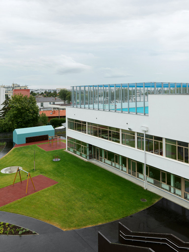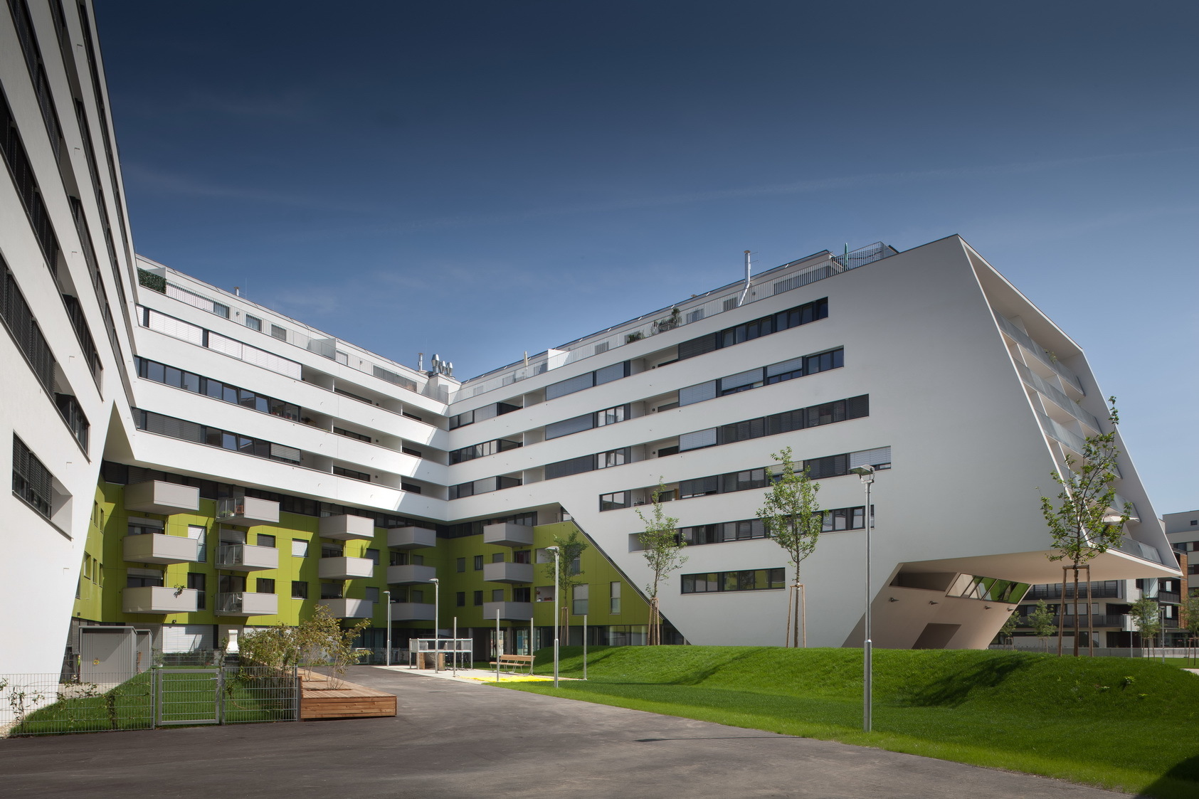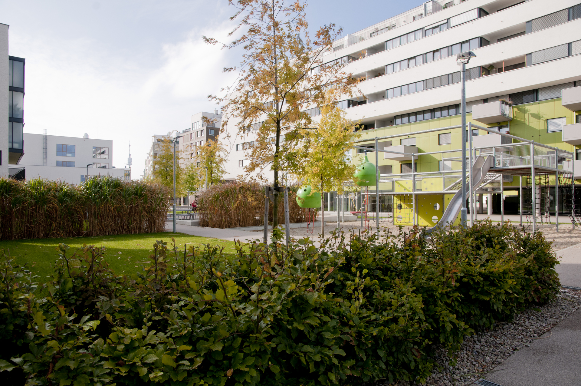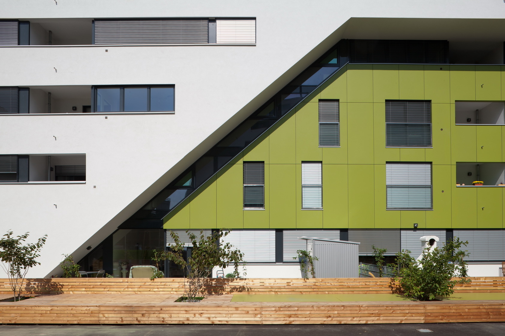 Mietergärten, Gemeinschaftseinrichtungen wie Wellnessbereich mit Sauna, Hobbyraum, Fahrradabstellräume und Waschküchen bieten Raum für Begegnungen. Darüberhinaus verfügt jede Wohnung über einen privaten Freiraum wie etwa Balkon, Loggia oder (Dach-)Terrasse. Zusätzlich bildet der U-förmige Baukörper einen halboffenen grünen Innenhof als Kommunikationsplatz in dem ansonsten offen gehaltenen Freiraumkonzept. (Text: Architekten, redaktionell überarbeitet)