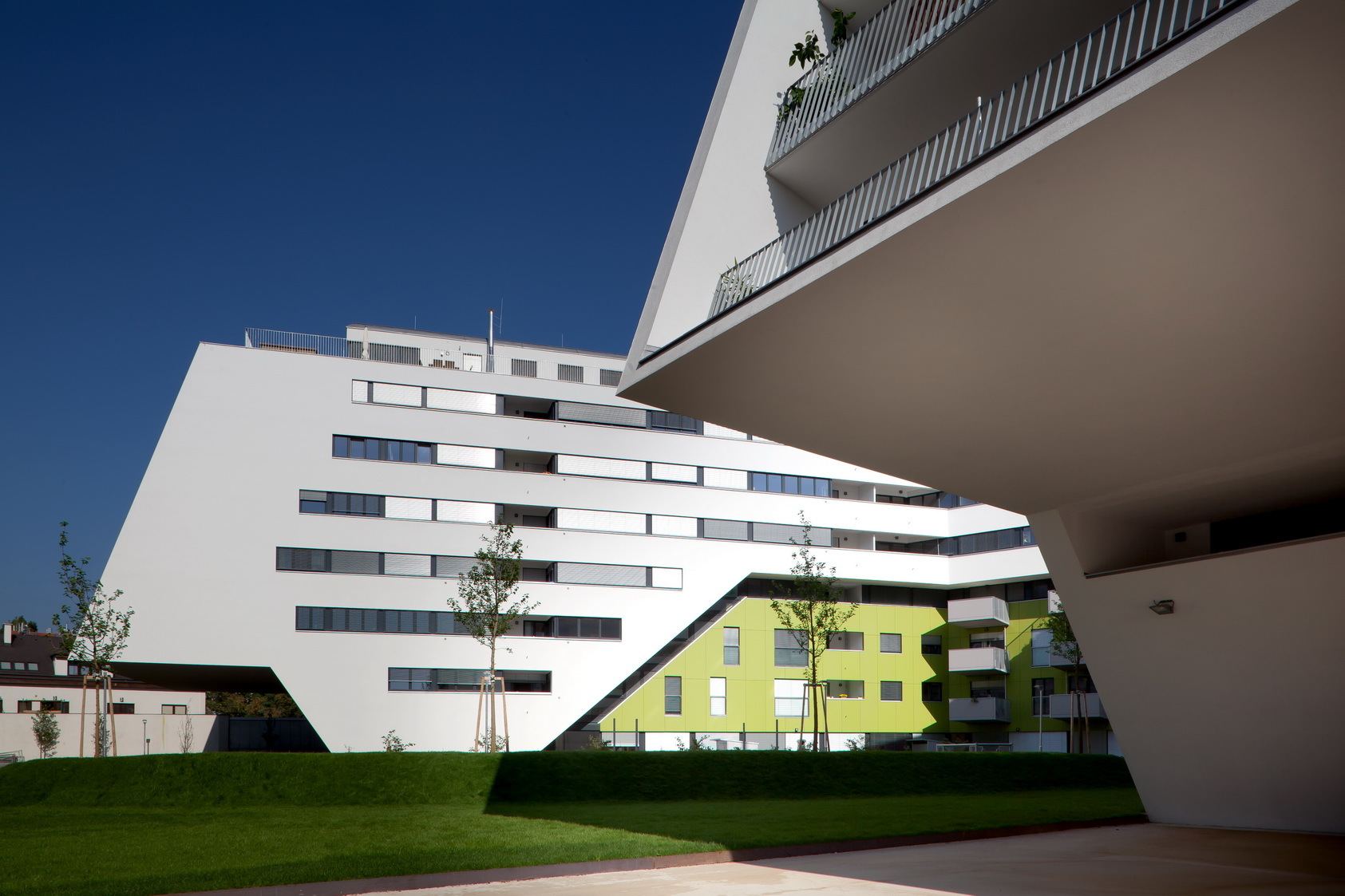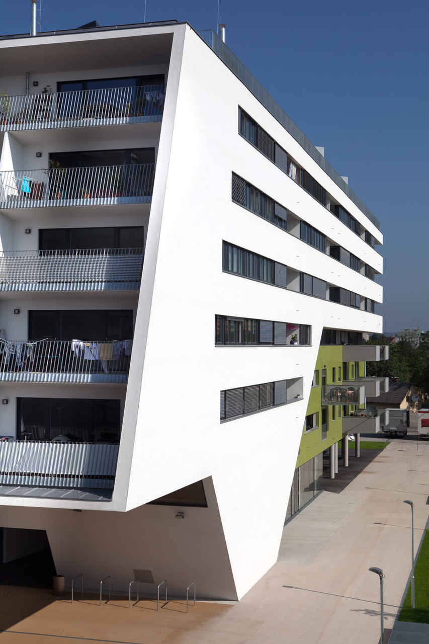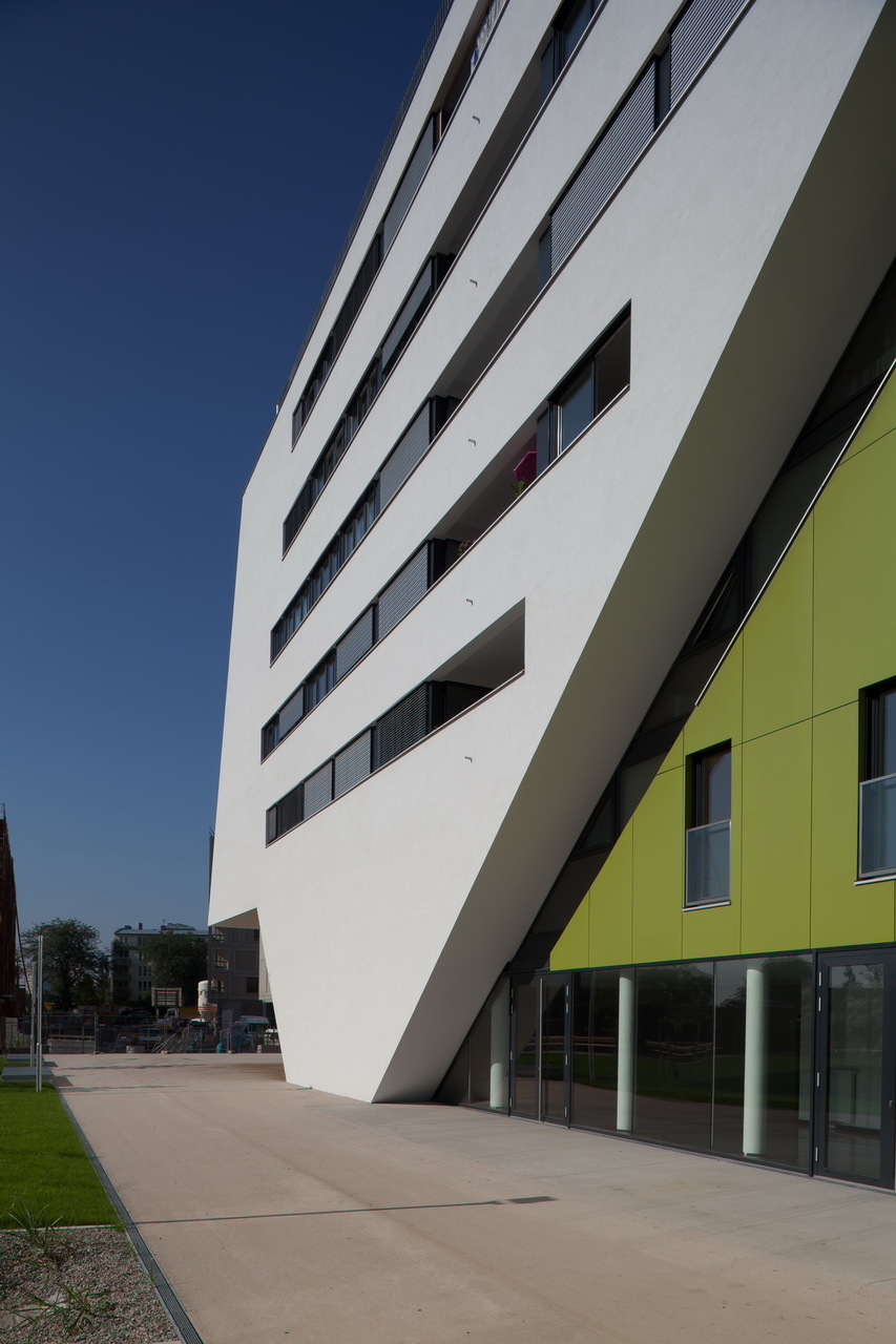 Die Architekten gerner°gerner plus mit dem Wohnbauträger Heimbau waren - als eines der beiden erstplatzierten Büros im vorangegangenen städtebaulichen Wettbewerb - beim Bauträger-Auswahlverfahren Fixstarter. Auf dem Areal der ehemaligen Bombardiergründe bildet der Wohnbau in Bauklasse IV (Traufhöhe bis 21 m) den Übergang zum dicht bebauten Wohngebiet westlich des ehemaligen Fabrikareals.Die Architekten entwickelten für 156 Wohneinheiten einen schiefwinkeligen, differenzierten Baukörper in U-Form, der sich vermeintlich aufbäumt – mit dem Ziel, die Masse des Wohnbaus leichter erscheinen zu lassen. Diese Wirkung wird durch die lineare Staffelung der Fassade und den Einsatz von weißem Putz zu grünen Eternitplatten verstärkt.