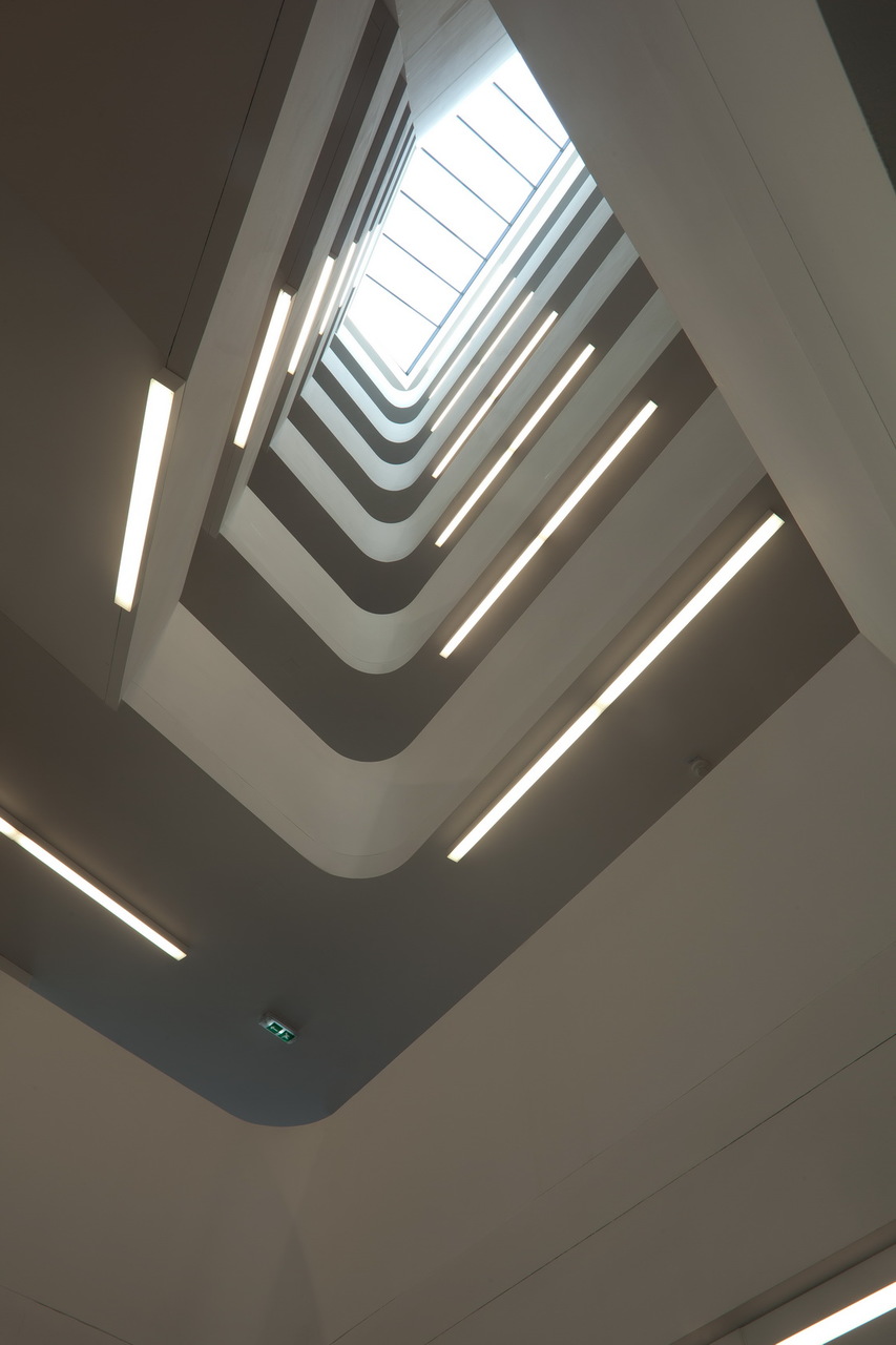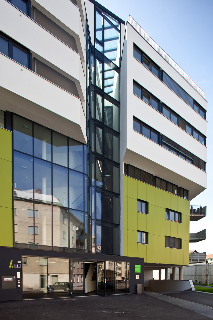 Die natürliche Belichtung ist ein Grundgedanke des Konzepts. Daraus ergeben sich die charakteristische Form der angeschrägten Seitenflügel und der verglaste Sockel mit den Gemeinschaftsräumen; vertikale Einschnitte leiten das Tageslicht bis tief in den Baukörper hinein. Die großzügigen und lichtdurchfluteten Stiegenhäuser sind mit geschoßverbindenden Durchblicken als Kommunikationsräume für die Bewohner angelegt. Die Grundrisse der 156 geförderten Mietwohnungen sind flexibel – der Innenausbau kann innerhalb der massiven Grundstruktur mit durchlaufenden Fensterbändern leicht an sich verändernde Bedürfnisse angepasst werden.