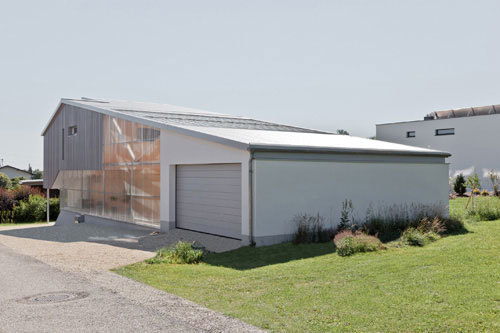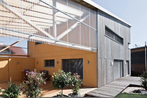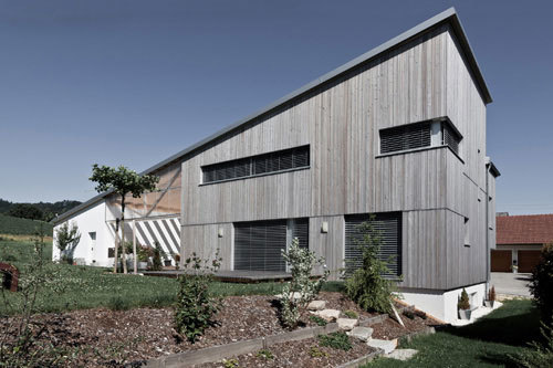Während die Nordfassade ein Satteldach aufweist, wird die eigentliche Trennung der beiden Entwurfsthemen durch ein von der Südfassade aus entwickeltes Haus mit Pultdach betont. Somit wirkt das Gebäude von zwei sich gegenüberliegenden Seiten, auch wie zwei unterschiedliche Gebäude. Diese Komplexität wird im Gesamtkontext von der Gestaltung des Grundrisses prinzipiell aufgehoben. Dieser zeigt in keinster Weise auf, dass die Dachlandschaft so different gestaltet sein mag. In klarer Formensprache sind die Wohnbereiche im Erdgeschoss angesiedelt, die durch den Innenhof nochmals ein besonderes Wohnambiente erfahren. Im Obergeschoss sind die Schlafzimmer angeordnet, die ebenso wie im Erdgeschoss hauptsächlich gegen Süden ausgerichtet sind. (Gekürzter Text der Architekten)