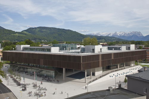 Salzburg ist eine Universitätsstadt. Das neue Gebäude der Kultur- und Gesellschaftswissenschaftlichen Fakultät manifestiert dies im besten Sinne und auf einem zeitgemäßen Niveau. Es ersetzt nach einem langen Prozess der Projektentwicklung die in den 1960er Jahren als zehnjähriges Provisorium errichteten Plattenbauten, in denen schließlich rund 40 Jahre lang Teile der Geisteswissenschaftlichen Fakultät unter kläglichen räumlichen Bedingungen untergebracht waren.Das neue Gebäude leistet weitaus mehr, als nur den heutigen funktionalen Standards zu entsprechen. Es ist nicht nur ein stimulierender Lern- und Arbeitsort, sondern es erfüllt alle Voraussetzungen, um im Sinne einer offenen Hochschule den Dialog mit der außeruniversitären Öffentlichkeit – im übertragenen wie wörtlichen Sinn – zu führen. An der Schnittstelle zwischen Zentrum und Nonntal gelegen, vermag der markante Solitär zudem, den Salzburger:innen attraktive urbane Plätze zur Nutzung bereitzustellen und ein neues, räumlich qualitätsvolles Gelenk zwischen dichter Altstadt und durchgrünter Vorstadt zu bilden. Die Verschränkung zwischen wissenschaftlichem Betrieb und Öffentlichkeit vollzieht sich auf mehreren Ebenen und entwickelt sich von der Gebäudebasis bis nach ganz oben. Die Bibliothek bildet als introvertierter Hort des Wissens und der Konzentration den Sockel des Gebäudes. In Form eines transparenten Kubus, in dem sich zusätzliche Bibliotheksarbeitsplätze befinden, taucht sie nach oben in den öffentlichen Raum, wo sich unter den Institutsgeschossen ein ansteigender Platz entwickelt, der zu den neuen Sportanlagen und dem Naturraum im Stadtteil Freisaal überleitet.