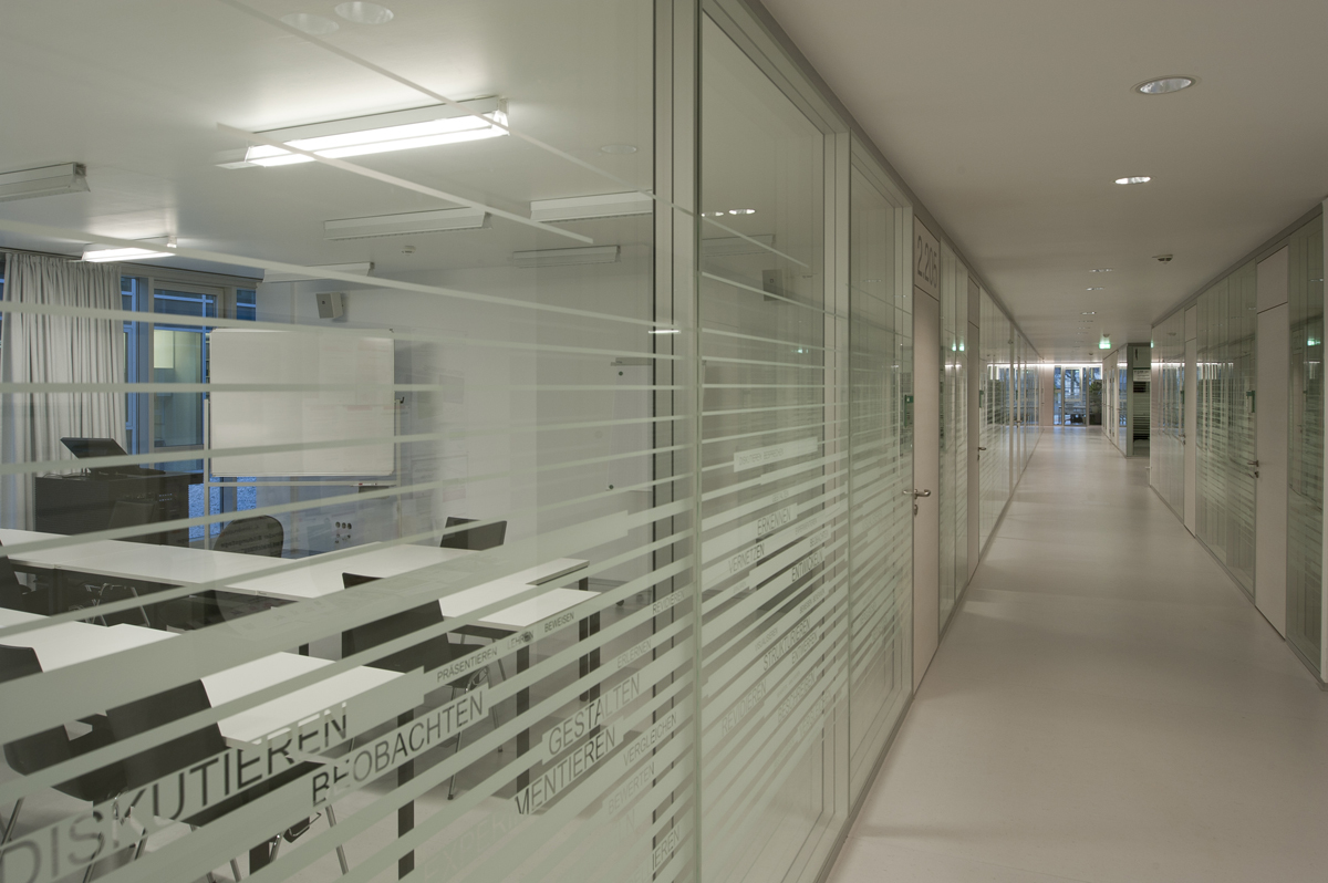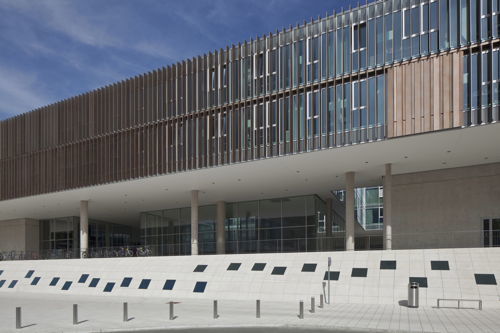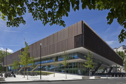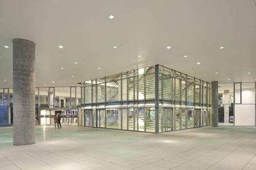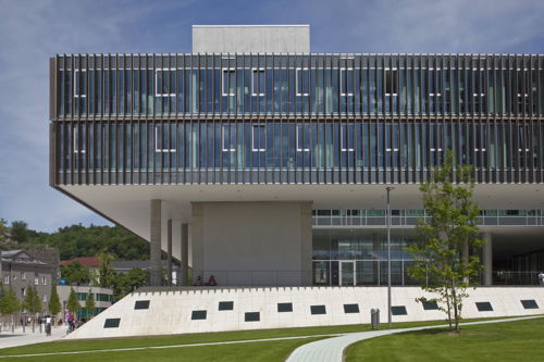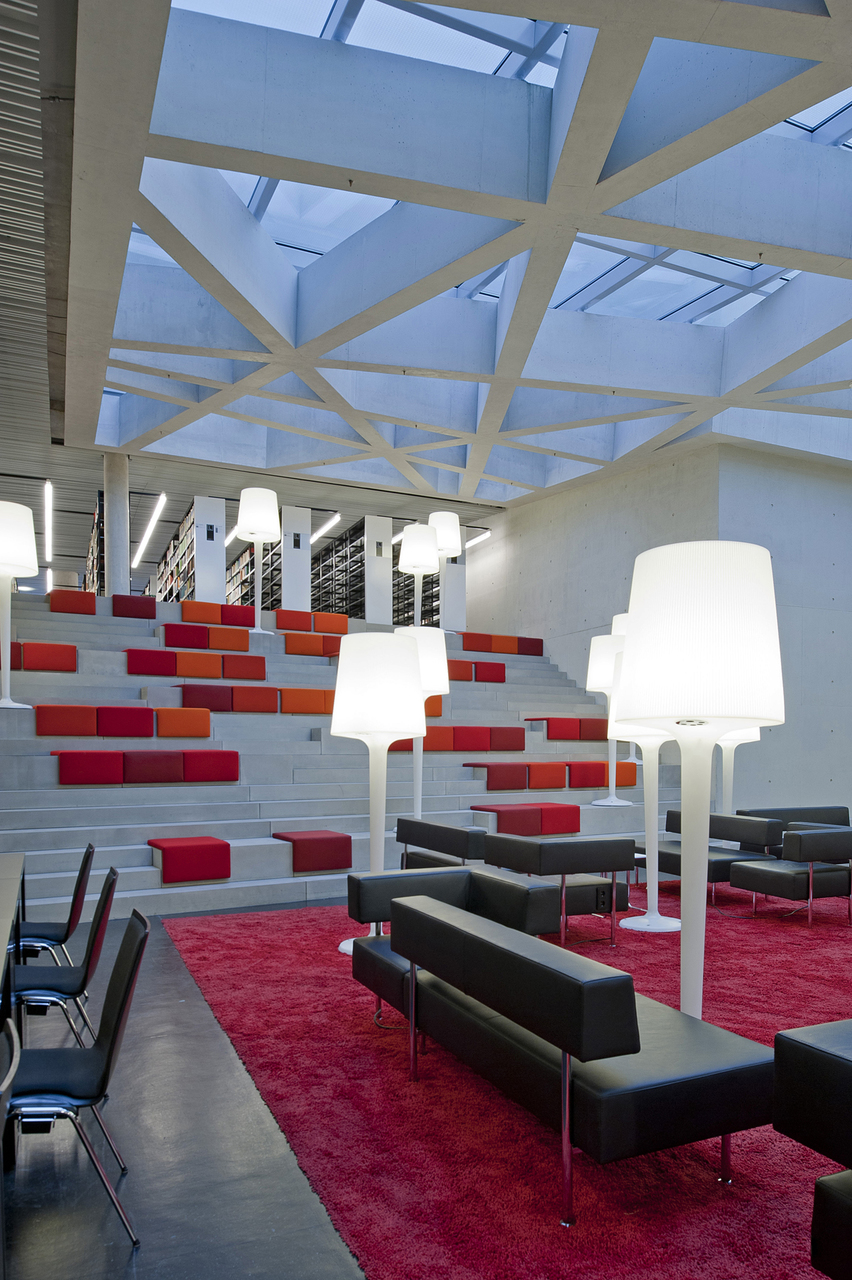 Im Inneren begünstigen Lichthöfe und ein hoher Grad an wohldosierter Transparenz die vertikale und horizontale Durchlässigkeit, die innerhalb des großen Volumens die Orientierung erleichtern, für geistige Offenheit stehen und ein neues Selbstverständnis innerhalb des universitären Klassensystems abbilden. Auf dem Dach entstand ein öffentlich zugänglicher urbaner Platz, der von einzelnen Institutsräumen perforiert wird. Mit einer ansprechenden Freiraumgestaltung und einer Cafeteria wird er zu einem angenehmen Aufenthaltsort, dessen Attraktivität nicht zuletzt darin besteht, dass er zwischen Boden und Berg eine neue Horizontebene im städtischen Raum erschließt.