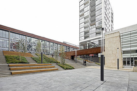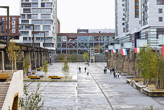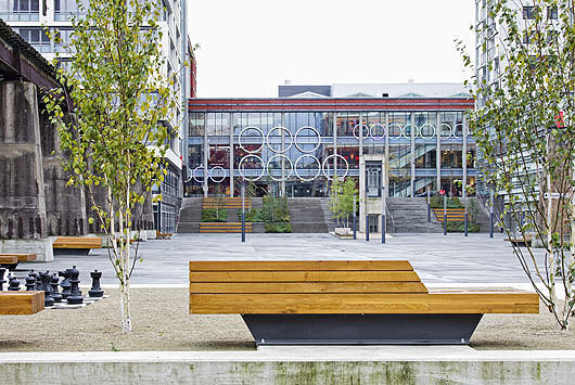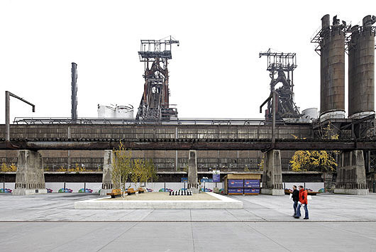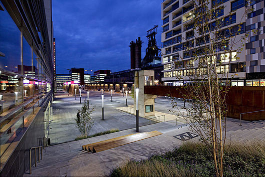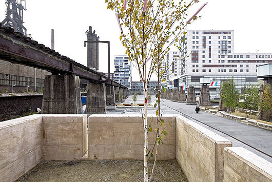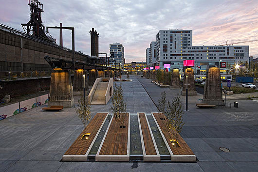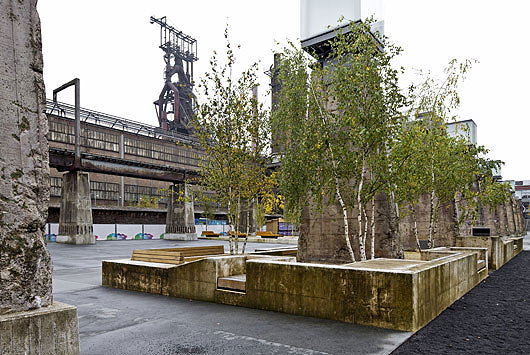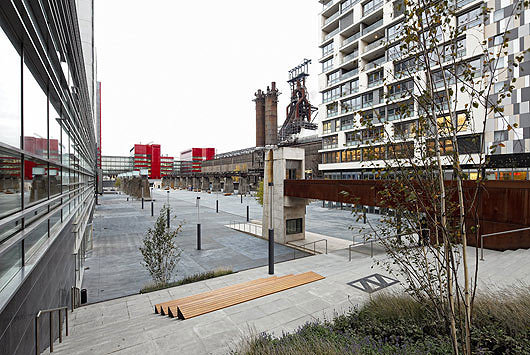 Zwischen zukunftsgewandten Hochhäusern und den Hochöfen der Vergangenheit bildet der Stahlhof den Quartiersmittelpunkt des neuen Stadtteils Belval Ouest, der in Luxemburg auf dem Gelände eines ehemaligen Stahlwerks errichtet wird.Die Atmosphäre der stillgelegten Industrieanlage war geprägt von Weite und Rauheit sowie von Pioniergewächsen wie Moosen und Birken.