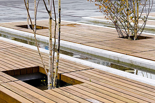 Aufenthaltsbereiche und Neupflanzungen werden zu Inseln zusammengefasst, die weite Teile des Platzes leer lassen und gleichzeitig in dieser Leere als Anlaufpunkte dienen.