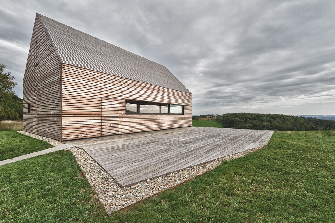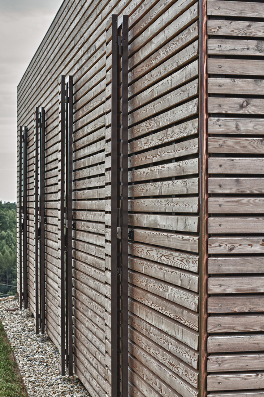 Da das Sommerhaus in den Wintermonaten nicht bewohnt wird, wurde eine Hülle aus Lärchenrost entwickelt, die komplett geschlossen werden kann. Das Haus steht dadurch in den unbewohnten Wintermonaten unaufdringlich und skulptural in der Landschaft. Um dies zu erreichen, wurden Klapp- und Faltläden entwickelt, die in geschlossenem Zustand, bündig mit der Fassade und ebenfalls mit Rhombenschalung belegt, mit der Hülle verschmelzen. Die scharfen Kanten der Kubatur werden durch Eckbleche aus Kupfer gebildet.