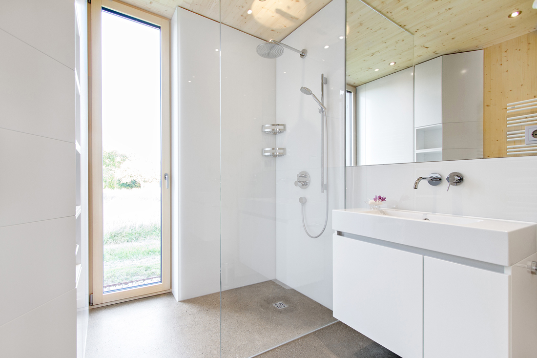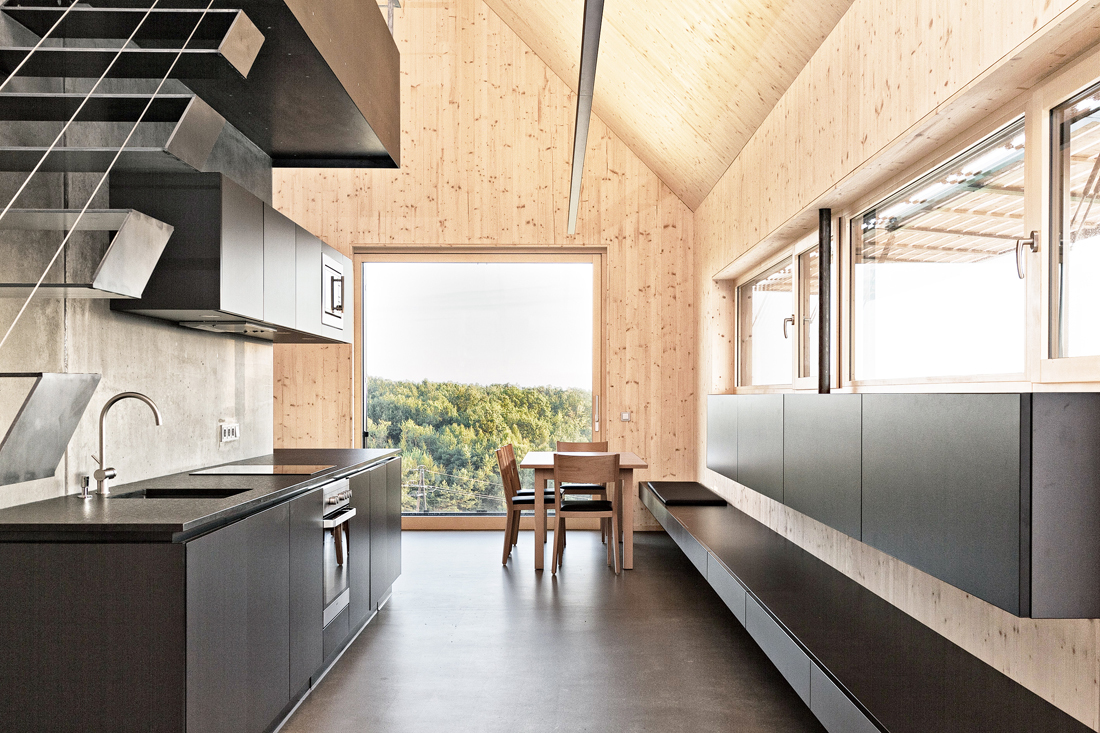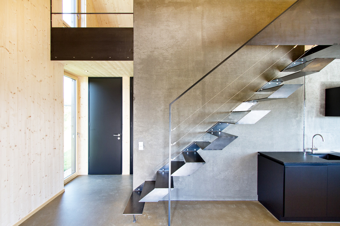 Der Keller ist in Stahlbeton-Massivbauweise ausgeführt. Das EG und OG wurde als reiner Holzbau errichtet. Dabei wurden die unverkleideten Kreuzlagenholzelemente neben ihrer statischen Funktion auch als gestaltende Elemente im Innenraum wirksam. Als Gegengewicht stehen dem großflächig eingesetzten Werkstoff Holz Sichtbeton und Stahl als Materialien gegenüber. Die Materialien wurden bewusst unbehandelt und unverkleidet eingesetzt und bilden in ihrer Kombination eine homogene Raumwirkung.