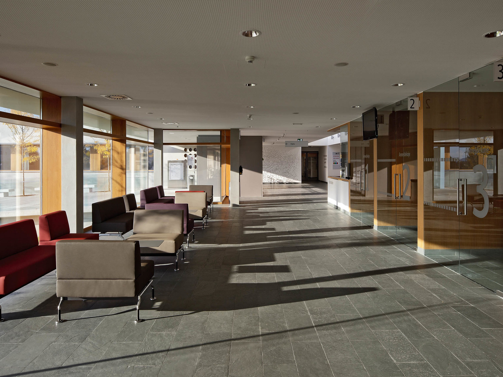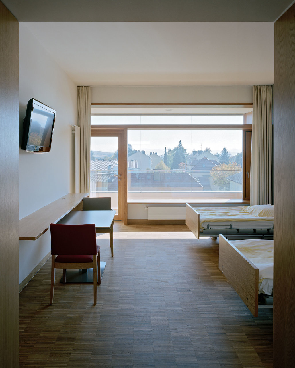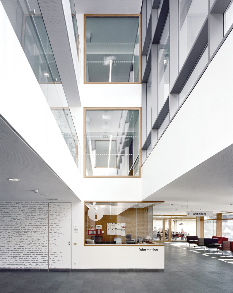 Westlich schließt sich der neue Therapietrakt, im Osten der neue Stationstrakt an die Magistrale an. Zwischen beiden entsteht ein neuer Hauptzugang, sowohl für das bestehende Krankenhaus, als auch für die Lymphologie. Die beiden neuen Trakte bilden räumlich einen Vorplatz, der direkt an den südlichen Parkplatz anschließt. (Text: Architekten)