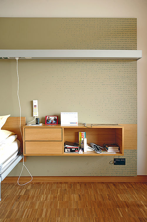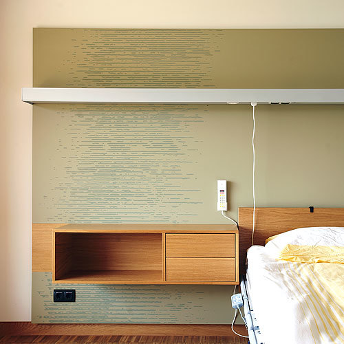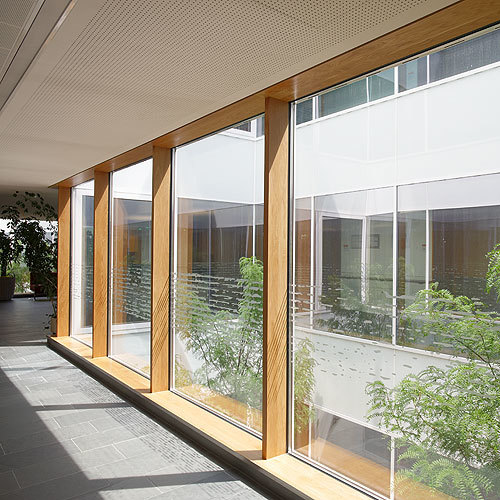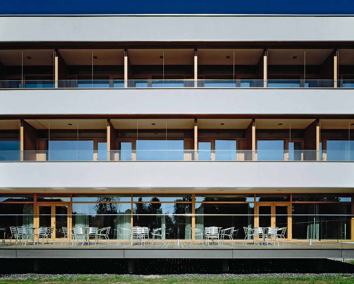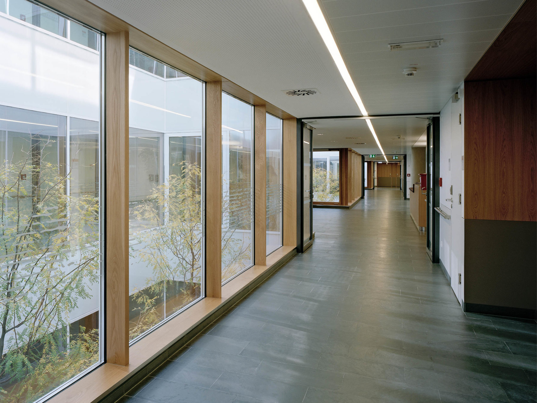 Westlich schließt sich der neue Therapietrakt, im Osten der neue Stationstrakt an die Magistrale an. Zwischen beiden entsteht ein neuer Hauptzugang, sowohl für das bestehende Krankenhaus, als auch für die Lymphologie. Die beiden neuen Trakte bilden räumlich einen Vorplatz, der direkt an den südlichen Parkplatz anschließt. (Text: Architekten)