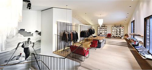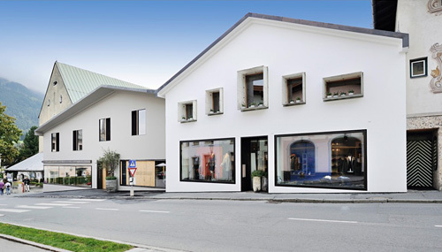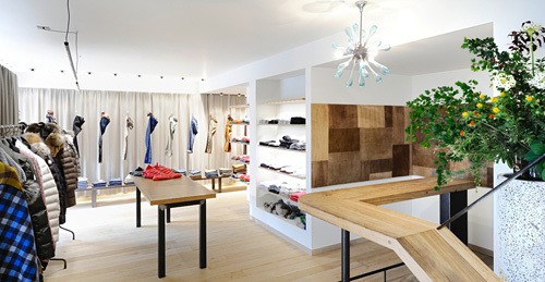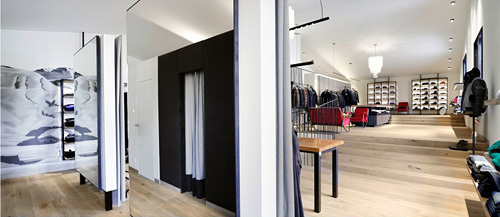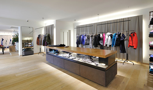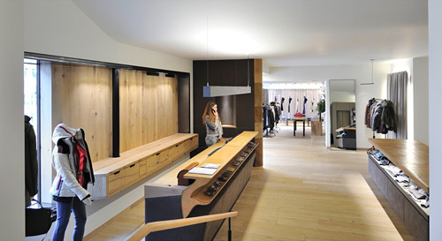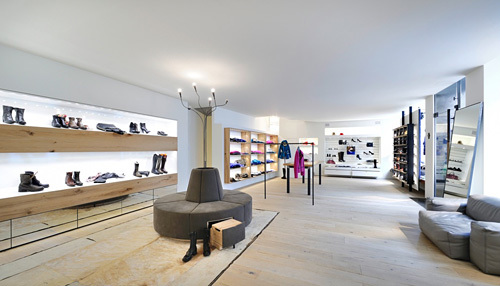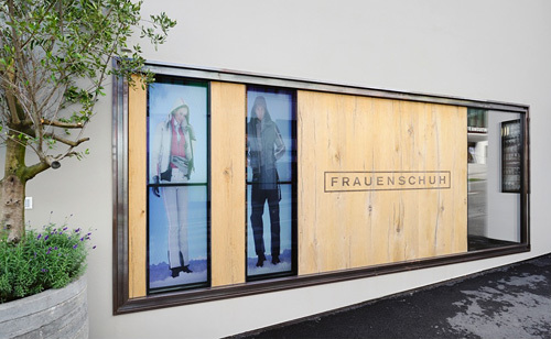 Für das Familienunternehmen Frauenschuh – ursprünglich eine Gerberei, in der maßangefertigte Kleidungsstücke aus hochwertigem Leder für Kunden aus aller Welt entstanden – wurde in einer ehemaligen Skifabrik eine neues Geschäft eingerichtet, das in seiner Optik und Haptik der dort angebotenen Luxury Sportstyle Fashion entspricht. Hirschlederwände, Stoffe aus der eigenen Kollektion, spezielle Lichteffekte und Eichenholzböden in einer modernen aber auch traditionsbewussten Umsetzung bieten die „Bühne“ für den Hauptdarsteller – die eigene Mode.Das Konzept der Bühne wird mit Vorhängen, Theater Strahlern, Wandbemalung und Videowall unterstrichen – Elemente, die es ermöglichen, das Erscheinungsbild des Geschäftes in kurzer Zeit ohne bauliche Eingriffe zu verändern. Ähnlich wie auf einer richtigen Theaterbühne ist das Licht direkt auf den „Hauptdarsteller“ – die Kleidungsstücke – gerichtet, die damit maximale Aufmerksamkeit erhalten.