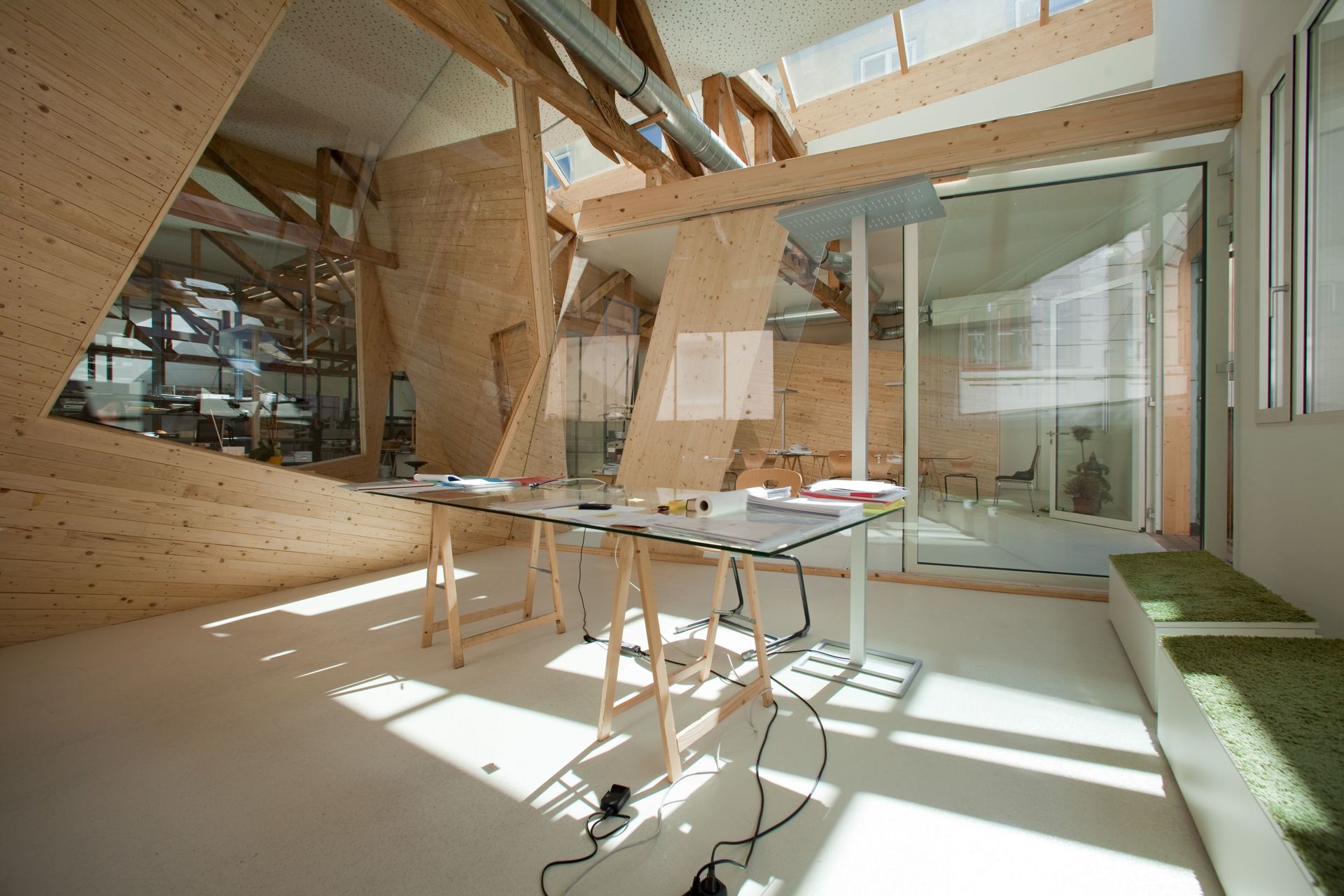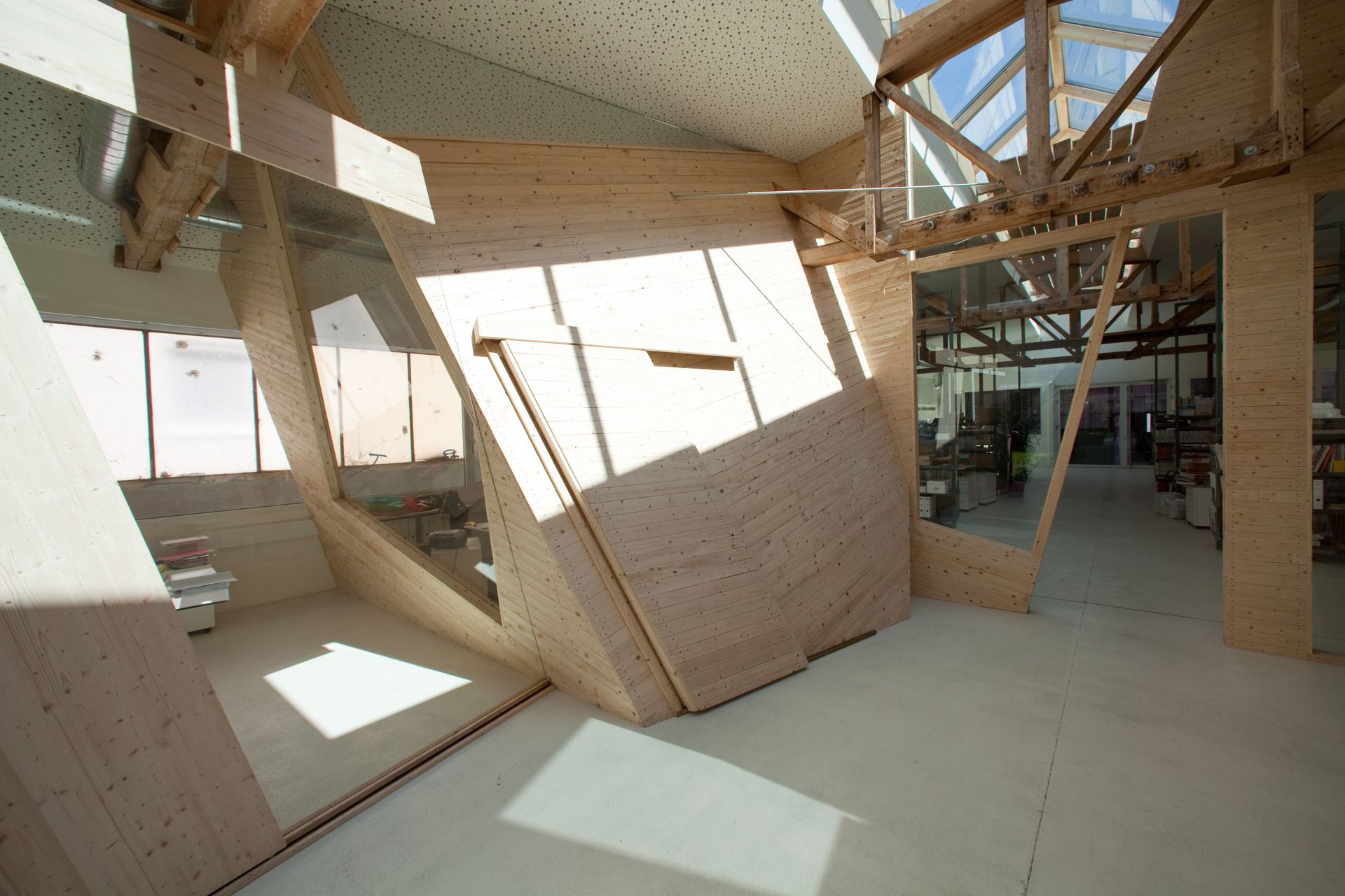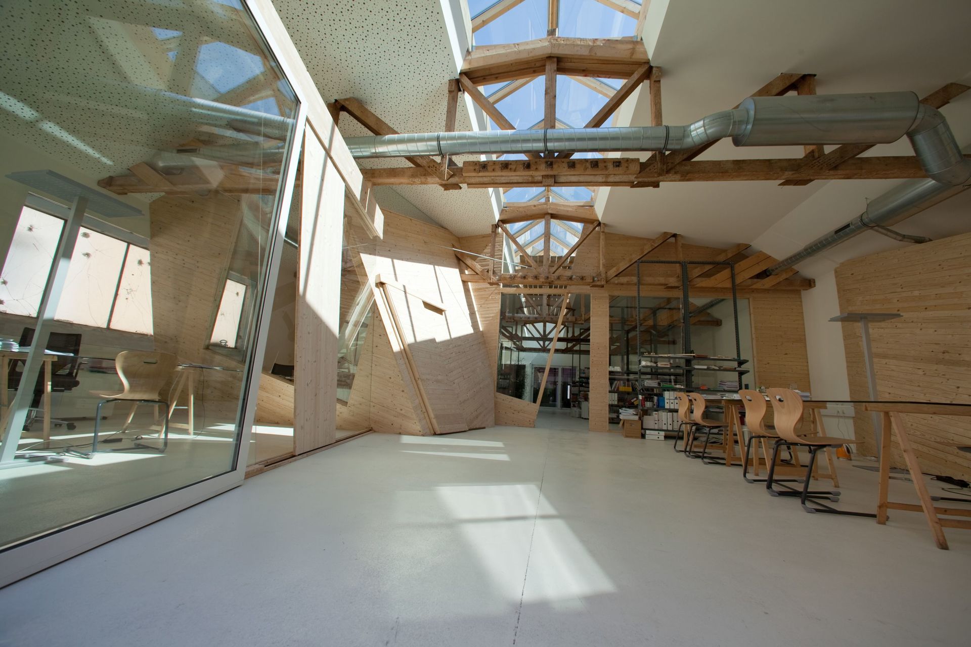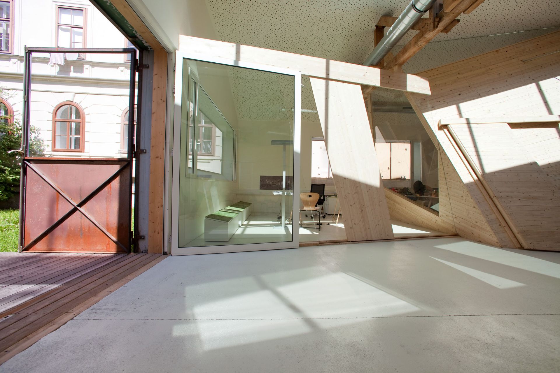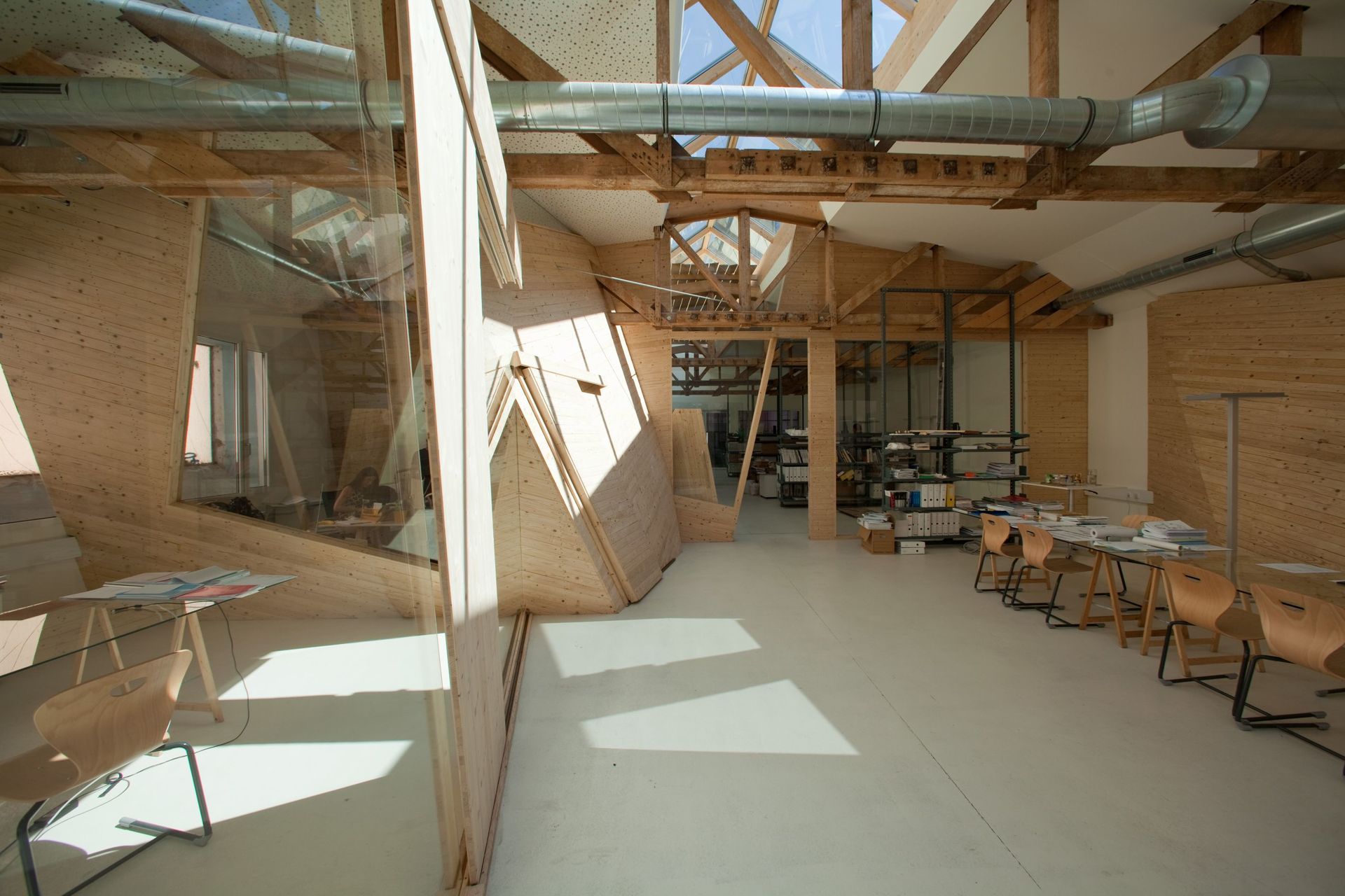 Die vorhandene Holzstruktur des Daches wurde freigelegt und für die weiteren raumbildenden Maßnahmen verwendet. Wesentlichen Anteil an der neuen Raum- und Lichtsituation hat das 25 m lange Oberlicht, welches mit einer Leimbinder-Unterkonstruktion erneuert wurde. Großflächige Holz-Glaselemente lassen den gesamten Raum zu einer Raumskulptur werden, die in verschiedenen Tageslichtnuancen ein belebendes und anregendes Arbeiten und miteinander Kommunizieren ermöglicht.