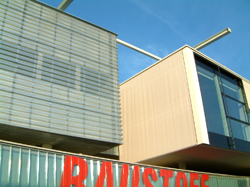 Im Erdgeschoss des Gebäudes befindet sich hinter einer geschwungenen Linitfassade (Industrieglas) der Verkaufs und Beratungsbereich für den Baustoffhandel. Im oberen Geschoss befinden sich in verschieden großen Kuben die einzelnen Abteilungen der Verwaltung, welche in unterschiedlichen Materialien ausgeführt wurden und teilweise über den Erdgeschossbereich auskragen. Der Raum zwischen den Kuben dient der Kommunikation zwischen den Mitarbeitern und den Kunden. Diese großzügige öffentliche Zone im Foyer des Verwaltungsbereiches spiegelt auch die Firmenphilosophie wieder „ Offenheit, Weitblick und Innovation „ (Text: Architekten)