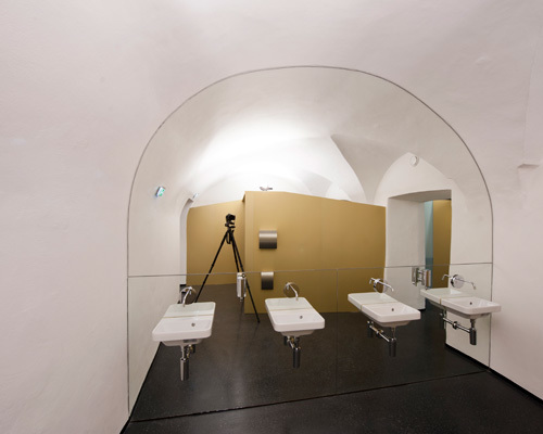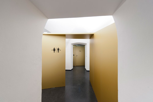 Einem anderen Geschäft dient Köberl jüngstes Projekt. An die 20 Jahre schon suchte die Stadt nach einem Raum für eine öffentliche Toilette, bislang ein Manko in der prosperierenden Altstadt. Rainer Köberl, der es immer wieder verstand, unauffälligen Orten neue Reize zu verleihen, half bei der Suche und wurde im Parterre des historischen Stadtturms, wo seit den 1970er-Jahren die Stadtturmgalerie angesiedelt war, fündig. Vor etwa zehn Jahren wurde sie erweitert. Köberl ärgerte sich bereits damals darüber, dass man Geld in die Erweiterung steckt, anstatt den Künstlern bessere Räumlichkeiten zu beschaffen. Er schlug vor, die Bedürfnisanstalt hier unterzubringen, und durfte sie auch gestalten: in Gold und Schwarz, sehr großzügig, wobei Köberl die damalige Erweiterung nun recht gelegen kam, stellte sie ihm doch helle Räume zur Verfügung, wie man sie ansonsten für ein WC kaum anzudenken wagt. Eine Bank zum Rasten im Kassenbereich und der dahinter liegende Hof werten das stille Örtchen zu einem Ort der Stille auf, an dem es sich ein paar Schritte abseits des Trubels gut ausruhen lässt. Und die Stadtturmgalerie? Sie bekam neue Räume in der nahen Hofburg.