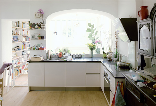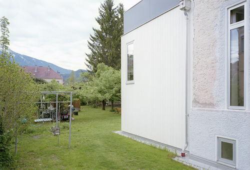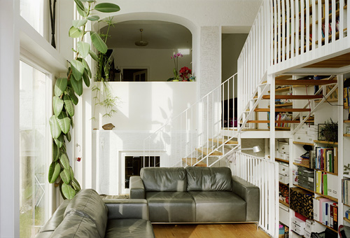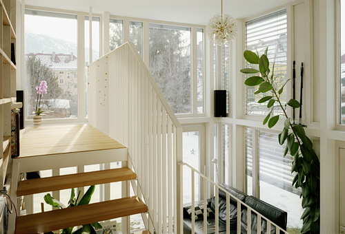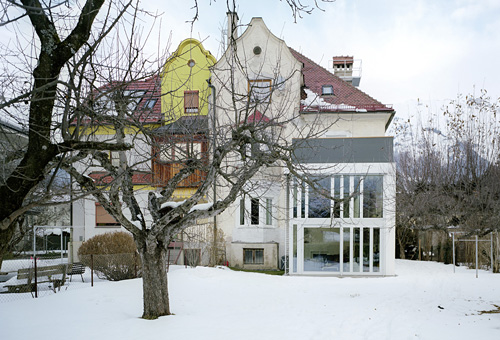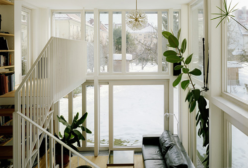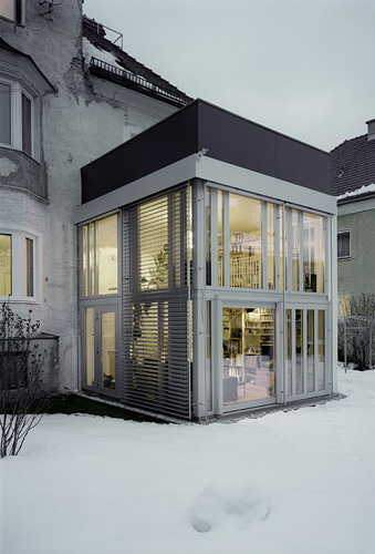 Die für die inzwischen vierköpfige Familie zu klein gewordene 2-Zimmer-Wohnung liegt im Hochparterre einer dreigeschossigen Doppelvilla aus der Gründerzeit. Unter Rücksichtnahme auf die bestehende Substanz wurde der Wohnung gartenseitig ein feingliedriger, auf zwei Seiten verglaster Wintergarten vorgelagert. Dieser neue Wintergarten, mit dem die Familie einen hellen, zwischen den Obstbäumen liegenden Wohnraum erhielt, ist zugleich Drehpunkt einer splitlevelartigen Neuorganisation der bestehenden Substanz. Eine Treppe führt hinauf in die ein halbes Geschoss weiter oben liegende „alte“ Wohnung mit Küche, Essraum und nunmehr zwei Schlafzimmern, eine weitere Treppe hinunter in den ursprünglichen Kellerraum, der in räumlicher Einheit mit der Wohnfläche als Wohn-, Musik- und Gästezimmer adaptiert wurde. Durch die Ausnutzung des Niveauunterschiedes zwischen Wohnung und Garten konnte der Wintergarten mit einer Raumhöhe von 4,20 m realisiert werden, was den Einbau einer kleinen Galerie ermöglichte. Als Erweiterung nach Innen entstand hier ein zusätzlicher Rückzugsort zum Lesen, Denken und Ausruhen.
