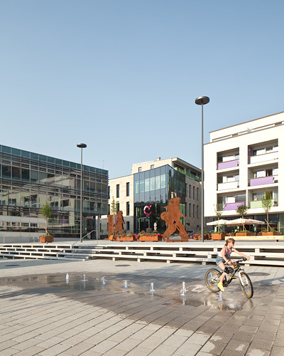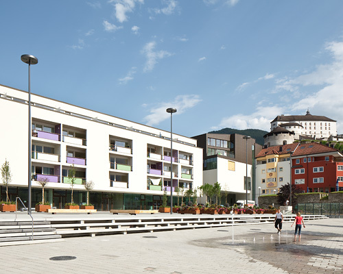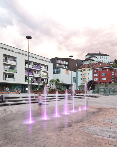 Mitten am Platz spritzt aus sieben Düsen Wasser in die Höhe – und zwar jenes Wasser, das vorher zur Kühlung des KISS aus einem Tiefbrunnen gepumpt wurde. Vor es in den Inn abgeleitet wird, wird es in der Fontänenanlage wiederverwendet und veranschaulicht dabei zugleich den Kühlbedarf des Gebäudes: an heißen Tagen sind die Fontänen bis zu 8 m hoch, an kühlen dagegen nur an die 50 cm. (Text: Claudia Wedekind)