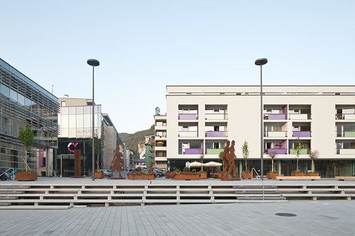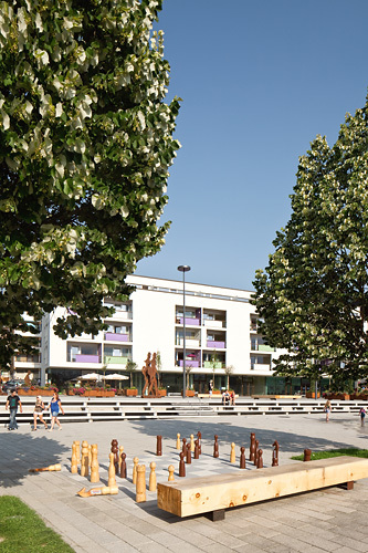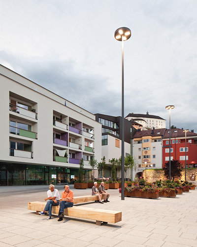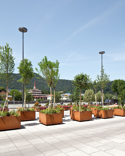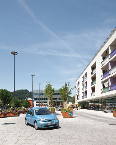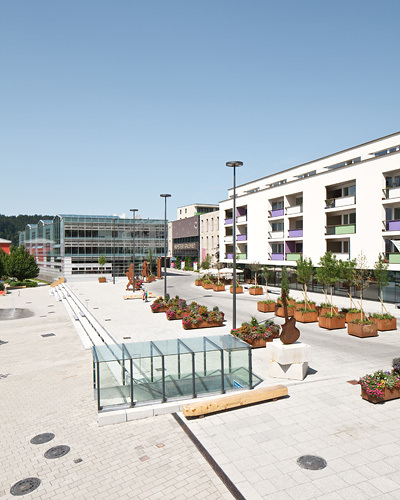 Der ca. 3.000 m² große Platz wurde als „Shared Space“ konzipiert, auf dem sich Fußgänger, Rad- und Autofahrer ohne eigens abgegrenzte Verkehrsflächen gleichberechtigt nebeneinander bewegen können. Es gibt weder Fahrspuren noch Gehsteige, einzig die durch Baumgruppen definierten Verkehrsinseln schaffen eine gewisse Verkehrsleitung. Der gesamte Platz ist in einheitlicher Materialität gestaltet, der Bodenbelag besteht aus Betonplatten in unterschiedlichen Größen, die Möblierung (z.B. Bänke und Tische) aus hellem Zirbenholz.