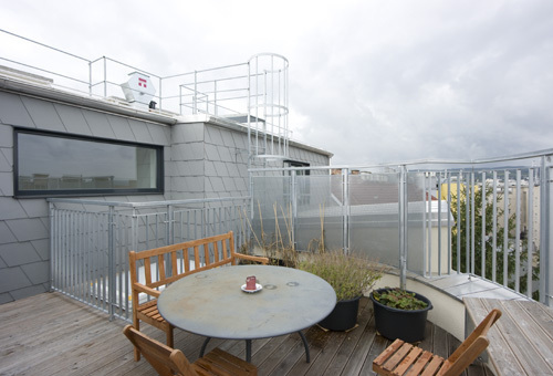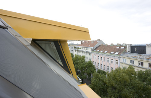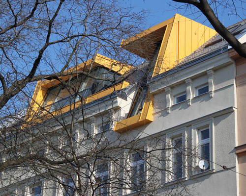 Die Aufstockung setzt über der gegliederten Straßenfassade des Bestands ein dezentes architektonisches Zeichen. Wie zwei Hände in schützender Geste treten zwei zueinander geöffnete Rahmen aus der Dachfläche hervor. Auch das Hauptgesimse wird dabei durchbrochen und die Verbindung zwischen dem Dachgeschoss und dem „Sockel“ des Hauses hergestellt. (Text: Architekten, redaktionell überarbeitet)