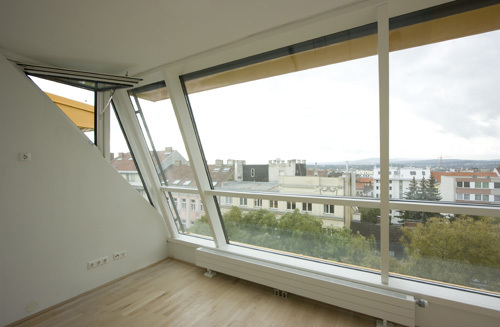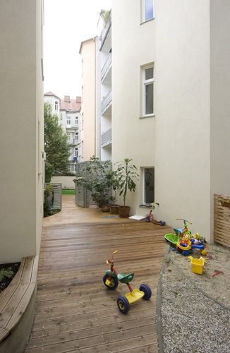 Im Straßentrakt wurde das Haus um zwei Dachgeschosse erweitert. Hier befinden sich Wohneinheiten für einen Aufenthalt von bis zu 6 Monaten. Im Zuge des Dachausbaus entstanden im 3. Obergeschoss (Bestand) zwei Wohngemeinschaften, im 1. Dachgeschoss vier neue Wohneinheiten und ein Büro, sowie vier Wohneinheiten und eine Gemeinschaftsterrasse im 2. Dachgeschoss. Frauen aus unterschiedlichen Kulturkreisen wird hier auf relativ engem Raum ein zwar nur temporäres, in jedem Fall jedoch „geborgenes“ Wohnen ermöglicht. Für die Planung der Wohnungsausstattungen bedeutet das eine Gratwanderung zwischen Notwendigkeit und Komfort. In der Gestaltung der Grundrisse wird insbesondere auf die verschiedenen Bedürfnisse von Bewohner:innen und Angestellten eingegangen. Gemeinschaftszonen werden sowohl auf den Wohnebenen als auch im Souterrain angeboten, wobei die Gemeinschaftszone im Souterrain in Sichtverbindung mit dem Innenhof, der durch Neugestaltung und den Einsatz von freundlichen Farben und Materialien Freiraumqualität erlangt hat, überwiegend von Kindern genutzt wird.