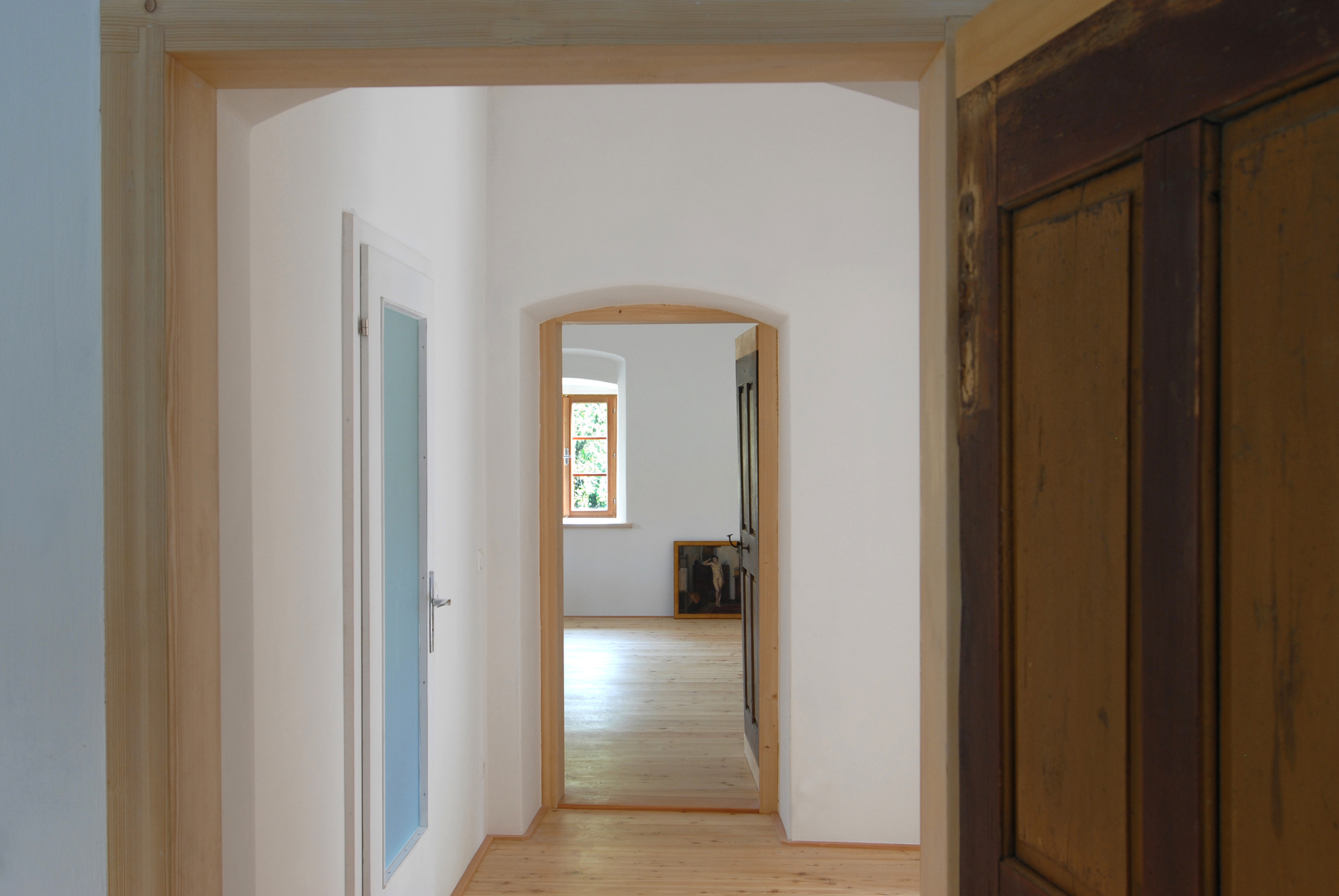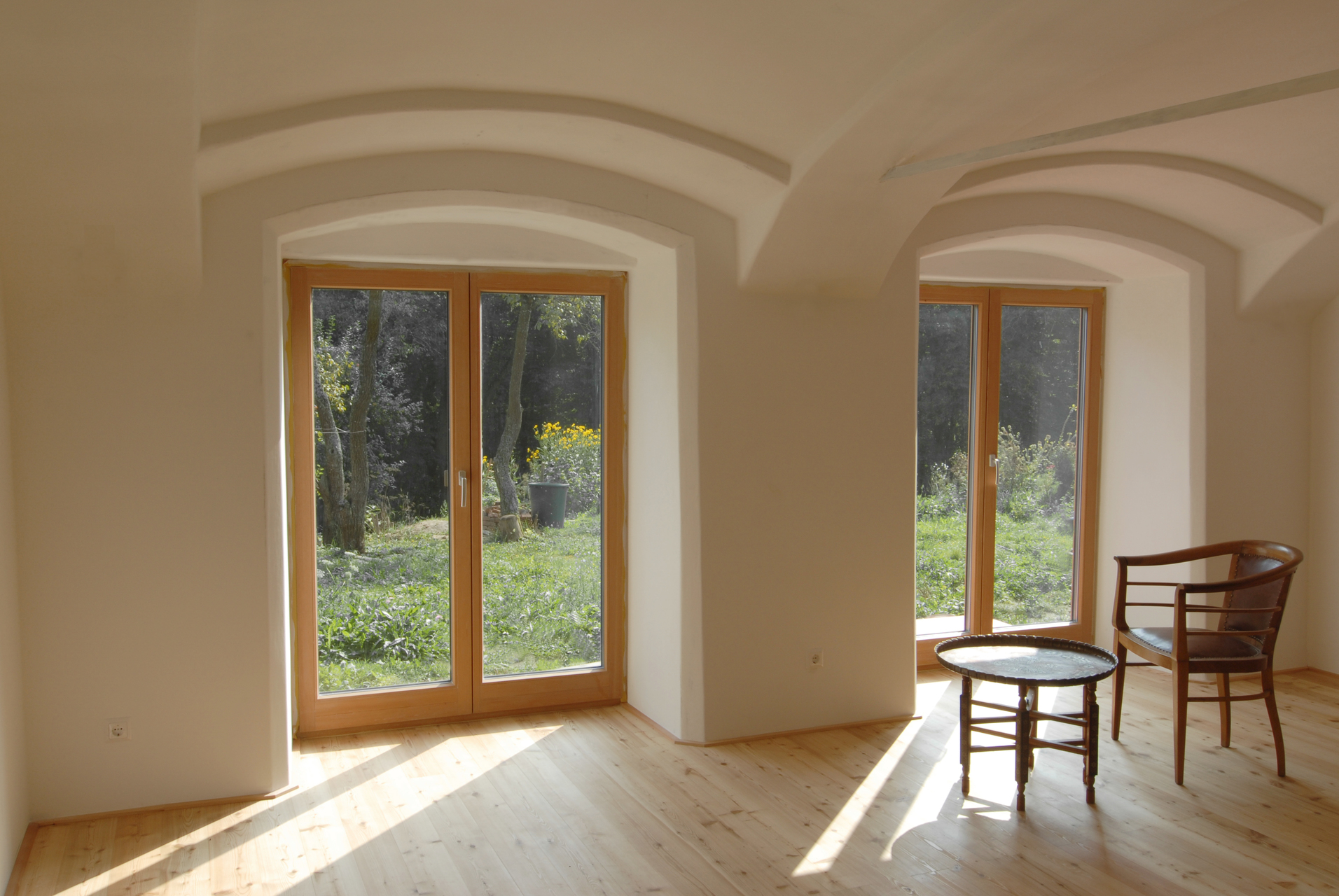 Technisch wurde das Haus, unter handwerklicher Beteiligung der Auftraggeber:innen, behutsam auf den neuesten Stand gebracht und der Energieverbrauch um 80% gesenkt. Das alte Gemäuer wurde innen mit Wandflächenheizung und Lehmputz versehen. Alle verwendeten Materialien wie Lehmputz innen, Kalkputz außen, Sumpfkalkfarbe und Lärchenholz respektieren den Bestand und machen das Raumklima extrem behaglich.