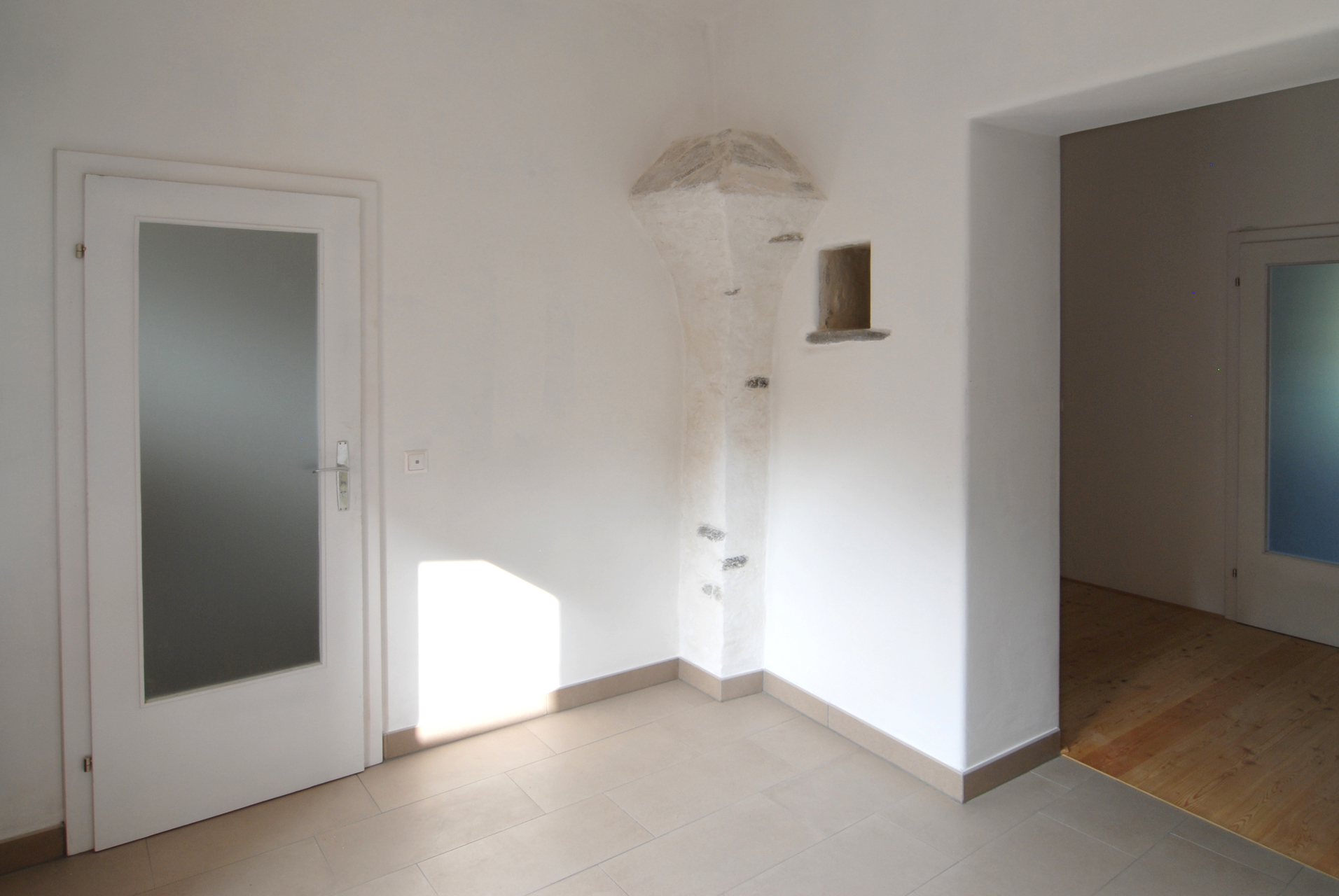 Türen aus verschiedenen Epochen – Fundstücke aus dem Haus – wurden vom Eigentümer, der Restaurator ist, aufgearbeitet und wiederverwendet. Die Solaranlage am Dach unterstützt die Stückholzheizung und produziert das warme Wasser.