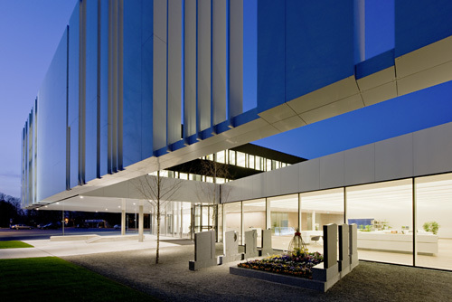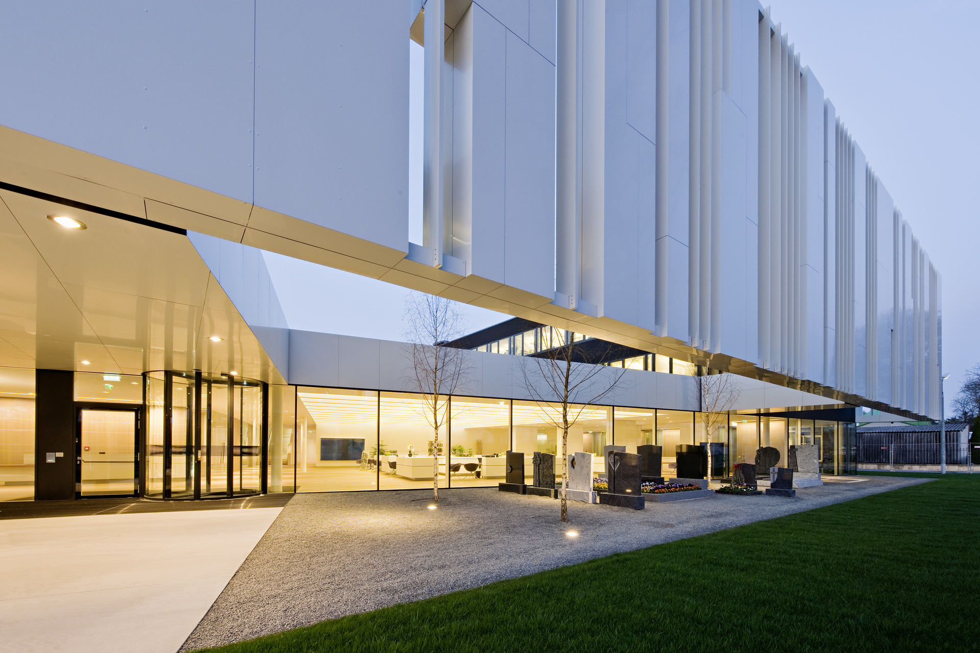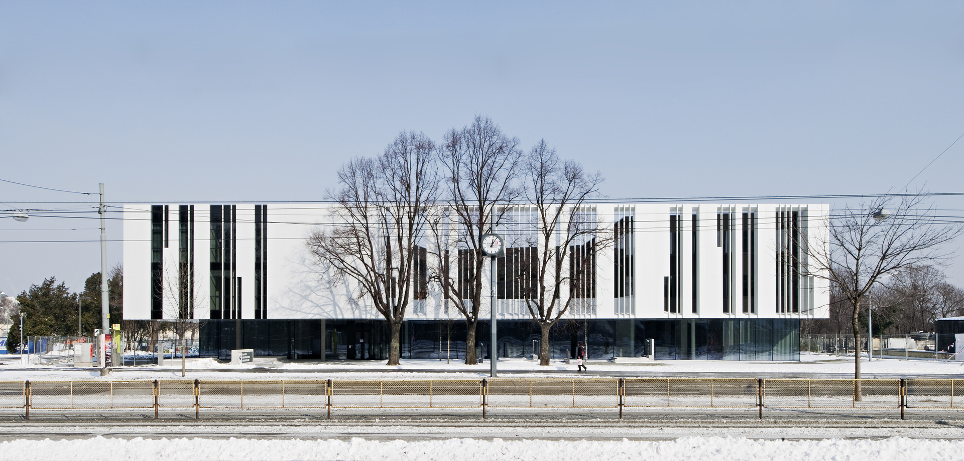 It's not like Delugan-Meissl. So streng hat man dieses Architekturbüro noch nie erlebt, so ganz unorganisch, so unheimlich rigide. Von außen ist das Haus fast quadratisch, von innen hat es den Zuschnitt eines U. Aber das sieht man von außen nicht, weil die Fassade aus vertikal gereihten, formal vollkommen unsystematisch entwickelten, weißen Aluminium-Sandwichpaneelen eine Gebäudehaut bildet, die dem großen Volumen architektonisch eine Fassung gibt. Allerdings löst sich diese weiße, sehr strenge und in keinerlei Regelmäßigkeit nachvollziehbare Haut aus den plastischen Paneelen – sie haben Körper, das Material lässt sich biegen und knicken – manchmal von den dahinter liegenden Bürogeschoßen ab. Die sind nämlich in schwarzem Putz, mit schwarzen, bündig sitzenden Fensterbändern und getöntem Glas. Der Kontrast zur weißen, glatten Fassadenhaut könnte nicht besser funktionieren.