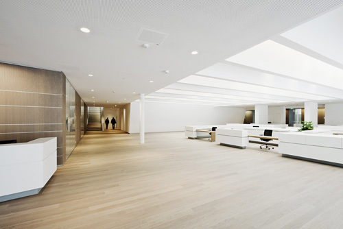 DMAA haben sich auf keinerlei Klischee eingelassen, das hierzulande immer noch in Bezug auf Trauerfälle gilt. Es ist ein Haus für die Lebenden, ob sie nun Kunden oder Mitarbeiter sind: sehr hell, sehr freundlich, sehr großzügig. Es kommen nur wenige Materialien vor – weiße Wände und viel Glas, bedruckt mit gepixelten Bäumen, was man allerdings kaum nachvollziehen kann, in den halböffentlichen Bereichen auch viel Holz, etwa als Eichenparkett, weiß gekalkt und geölt, auf dem Boden, oder in einer etwas kräftigeren Färbung an den Wänden; in den beiden Obergeschoßen, im reinen Bürobereich liegen dann Teppichböden; die weißen Gipskartonwände stoßen nicht direkt an die Fassade, ein breiter Glasstreifen bewältigt diesen Übergang; die Glastüren zu den Büros haben in Kopfhöhe eine mattierte Fläche, sodass man den Blicken der Vorübergehenden nicht ausgeliefert ist. Natürlich haben alle Büros räumlich einen Zuschnitt, der sie für die Mitarbeiter angenehm macht. Und die Architekten waren bei der Entwicklung der Grundrisse geschickt genug, um die Gänge – sie laufen immer aufs Tageslicht zu – so zu verschwenken, dass an den Knotenpunkten räumlich aufgeweitete Kommunikationszonen entstehen. Eine Hervorhebung verdient die sogenannte Kantine, ein sehr eleganter Raum, den man für Veranstaltungen auch buchen kann; und sicher müssen die Terrassen erwähnt werden, also jene Schnittstellen, wo sich die weiße Gebäudehaut von den schwarzen Putzfassaden der Bürotrakte ablöst. Ein Gebäude häutet sich, neue (Frei)Räume entstehen. Und man versteht, dass die Menschen diese Arbeitssituation lieben.