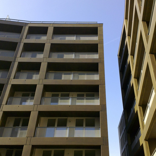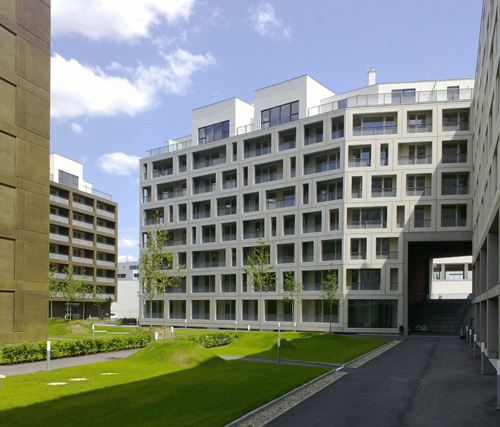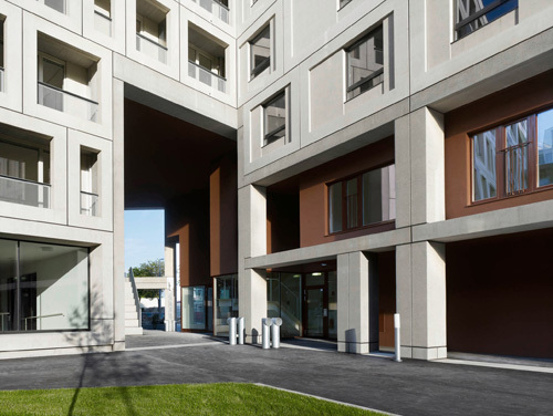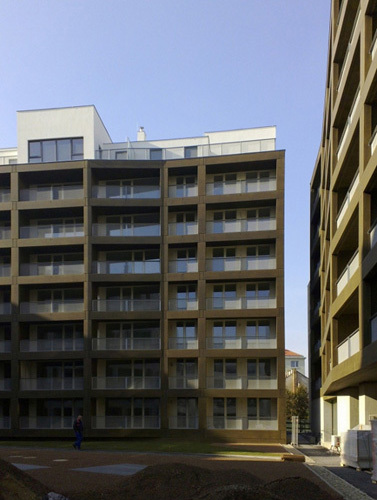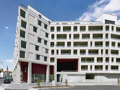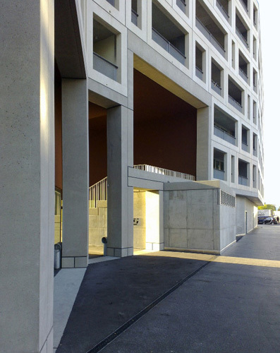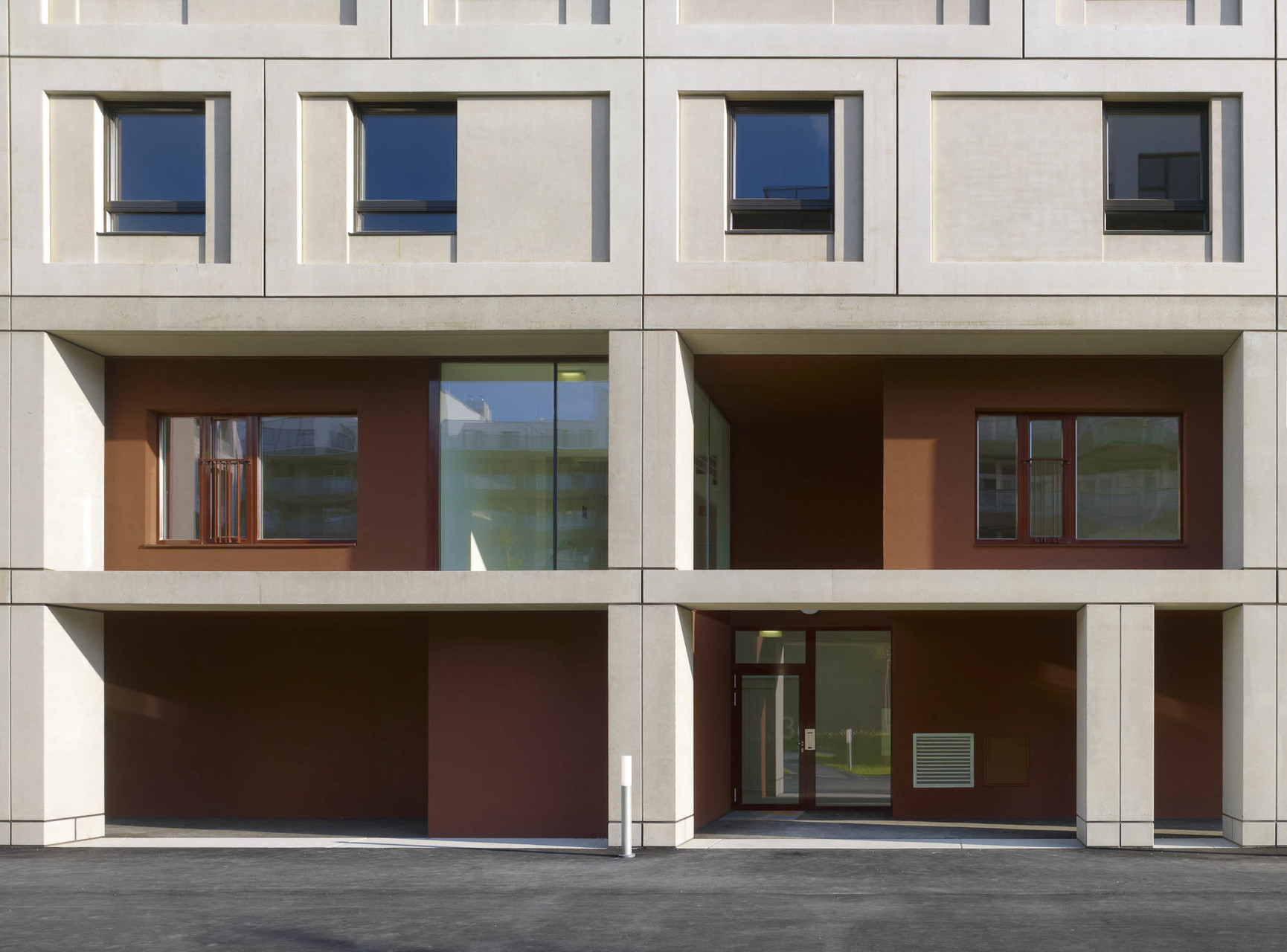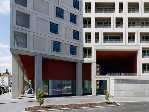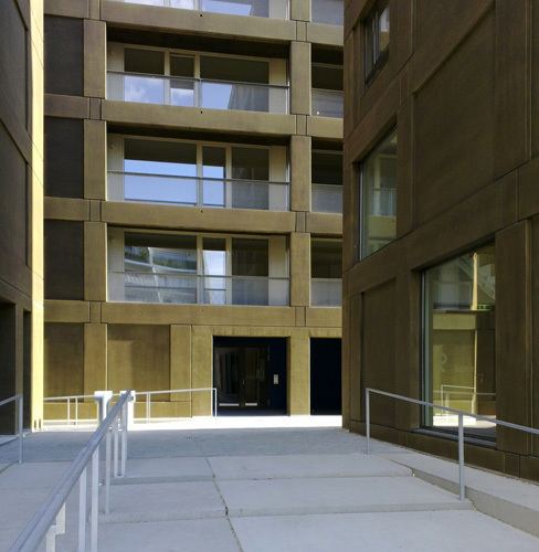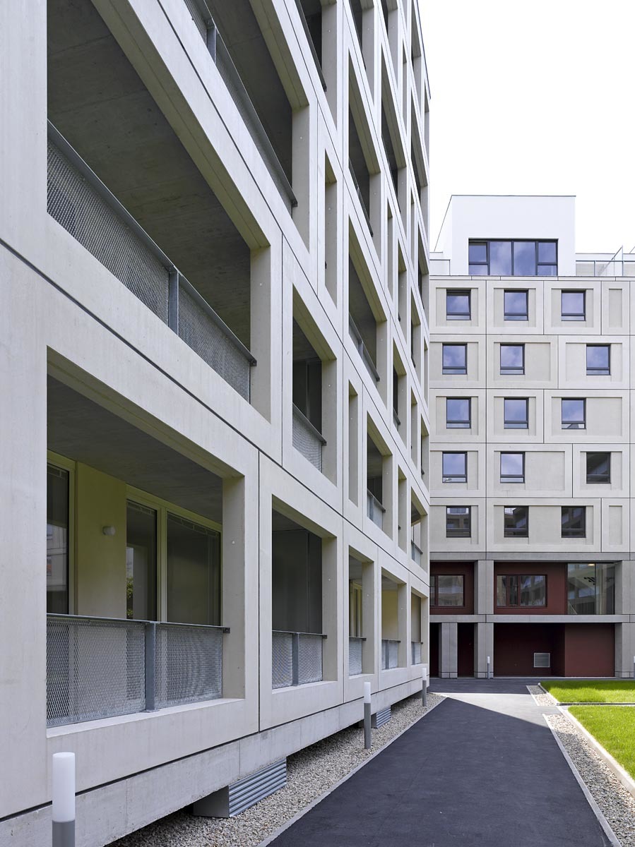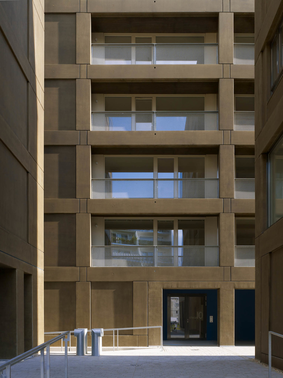Der Hofbaukörper ist in seiner Wirkung gewichtig und massig angelegt. Vorhänge auf rundumlaufenden Schienen hätten in den Loggien für textile, leichte Akzente sorgen sollen. Der Bauträger äußerte jedoch Bedenken hinsichtlich der Erhaltungskosten, schließlich wurden die Vorhänge auf Eigeninitiative der Bewohner vereinzelt angebracht. Der cremefarbige Stoff bildet einen gelungenen Kontrast zum braun lasierten Beton. Der Architekt bevorzugt die Lasur, weil durchgefärbter Beton – abhängig vom Betonierzustand häufig unerwünschte Farbunterschiede ausweist und starke Temperaturschwankungen während der Verarbeitung zu einem fleckigen Erscheinungsbild führen können (vgl. Stadtvilla von Marcel Meili und Markus Peter in der Beton-Mustersiedlung 9=12, Wien 14).