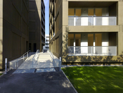Die Zugänge zu den Häusern sind hofseitig und allesamt großzügig verglast. Der Architekt legt besonderen Wert darauf, dass man beim Betreten des Gebäudes nicht in ein dunkles Loch hineingeht, sondern mit einem Blick in den Freiraum begrüßt wird. Für ein Fenster musste er sich jedoch besonders einsetzen: das Panoramafenster in der Tiefgarageneinfahrt. „Wozu braucht man Licht, wenn man in die Garage hinunterfährt?“ Diese Frage seitens Bauträger musste sich der Architekt gefallen lassen. Für gewöhnlich fährt man in ein schwarzes Loch. Das Panoramafenster belichtet nicht nur die Einfahrt. Hier teilt sich die Welt in ein oben und ein unten. Am Weg in die Unterwelt „erfährt“ man einen Blick in den Freiraum.