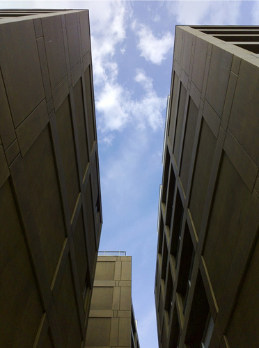Der zweiten Bauplatz (Hofbaukörper) hätte laut Flächenwidmung mit einem „Winkel“ bebaut werden sollen. Speziell für die im Innenwinkel liegenden Wohnungen bedingt ein Winkel jedoch ungünstige Belichtungssituationen. An Stelle des Winkels stehen nun drei eng zu einander orientierte Baukörper. Die Innenecke der Bauform öffnet sich gegen Westen hin und ermöglicht eine Belichtung der zum Hof hin orientierten Wohnungen, wie auch des Hofes selbst mit Abendsonne. Das Sonnenlicht lässt die lasierten Betonmauern „aufglühen“, die Fassade changiert in einen Bronzefarbton. Vergleichbar mit hell unterlegten Flächen in der Ölmalerei bringt der zu Grunde liegende, helle Beton die Farbe zum Leuchten.