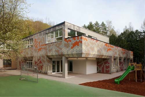 Die bunte Fassade aus 6 unterschiedlichen Faserzementschindeln repräsentiert die Schüler der vier Schulstufen, die - in Gruppen angeordnet und farblich harmonisch aufeinander abgestimmt - auch immer Teil einer Gesamtgefüges sind. (Text: Architekten)
