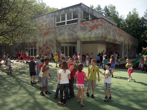 Die über einen Gang direkt mit dem Schulhauptgebäude verbunden Räumlichkeiten der Nachmittagsbetreuung sind unter möglichster Vermeidung von Gangflächen offen gestaltet, und gewähren einen fließenden Ablauf im Raumverbund mit zwei weiteren Räumen. Ein eigenes Stiegenhaus und eine Garderobe ermöglichen die direkte Zuordnung zum Schulhof, und somit eine autarke Nutzung auch außerhalb der Schulzeiten. Darüber hinaus wurde das Raumangebot der Schule um eine Klasse, Lehreraufenthaltsraum und Garderobe erweitert, wobei die unterschiedlichen Nutzungen in sich farblich harmonisch aufeinander abgestimmt sind.