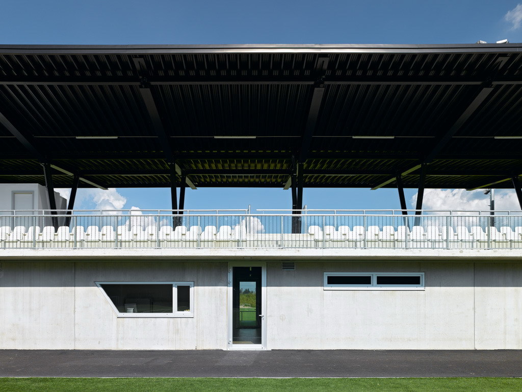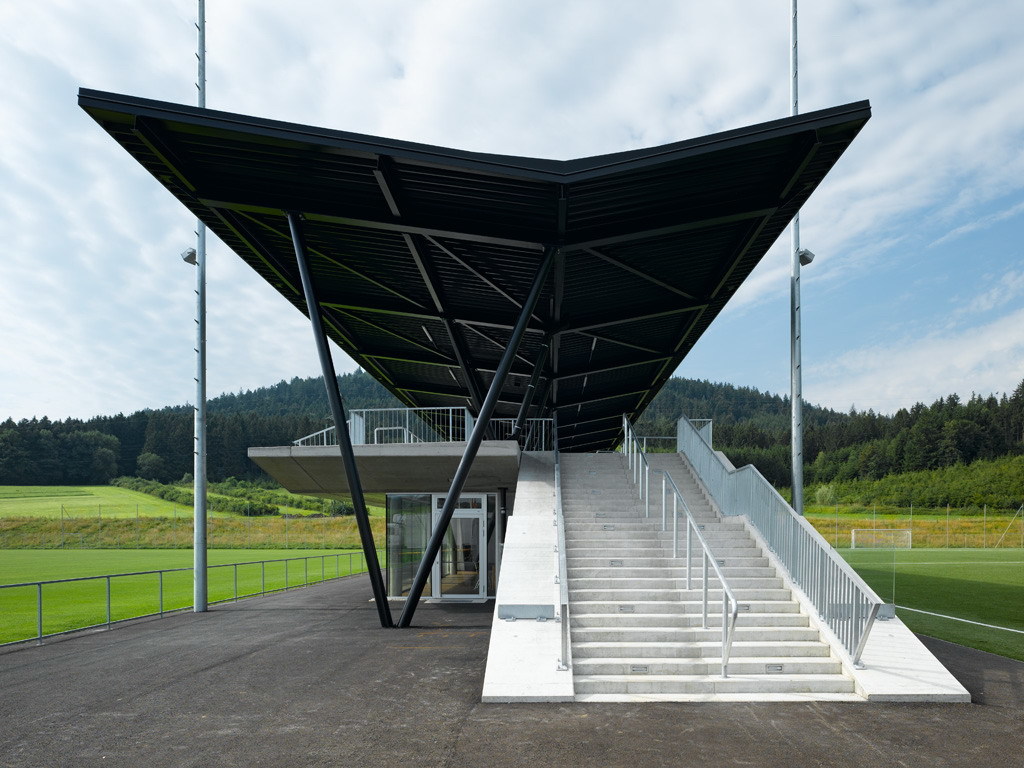 Das Tribünengebäude liegt zwischen den beiden Hauptspielfeldern. Der Vorbereich vor der Kantine dient als Zwischenraum und kann als Treffpunkt und Gastgarten genutzt werden. Eine breite Stiege führt auf den erhöhten Tribünenbereich, von dem aus beide Hauptspielfelder eingesehen werden können. Die Tribünenebene schließt an den Naturraum an, das Gebäude wird mit der Landschaft verzahnt und die topografische Integration des Gebäudes erreicht. (Text: Architekten)