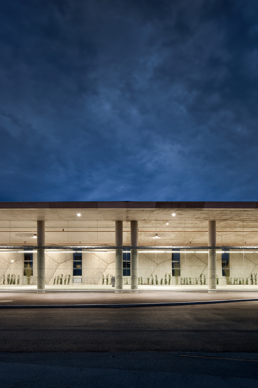 Ein wohldurchdachtes Kunstlichtkonzept, das den Raum zoniert und Akzente setzt, bewirkt, dass der Raum auch bei Dunkelheit als angenehm empfunden wird und der zur Remise gewordene Bahnhof noch nach Betriebsschluss nach außen leuchtet. Der Hauptzugang liegt an der östlichen Schmalseite, die Halle ist aber auch von Westen zugänglich, womit der Weg zum Bahnsteig von den Parkplätzen und den überdachten Fahrradabstellplätzen kurz gehalten wird. Diese notwendigen Parkflächen sind ebenso Teil des gestalterischen Ganzen wie der Vorplatz und der breite Gehsteigbereich, die mit Baumgruppen und Bodenleuchten akzentuiert wurden.