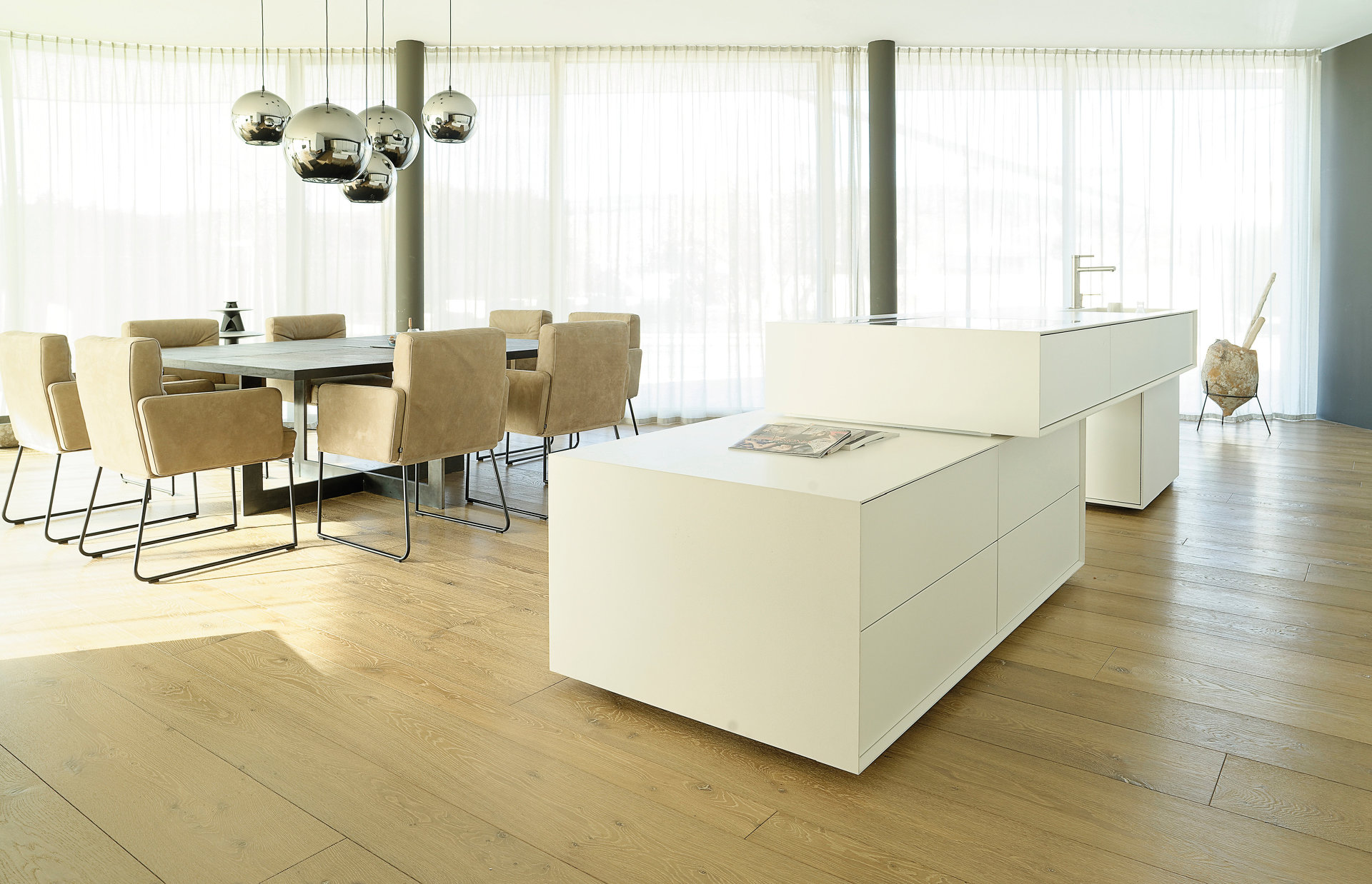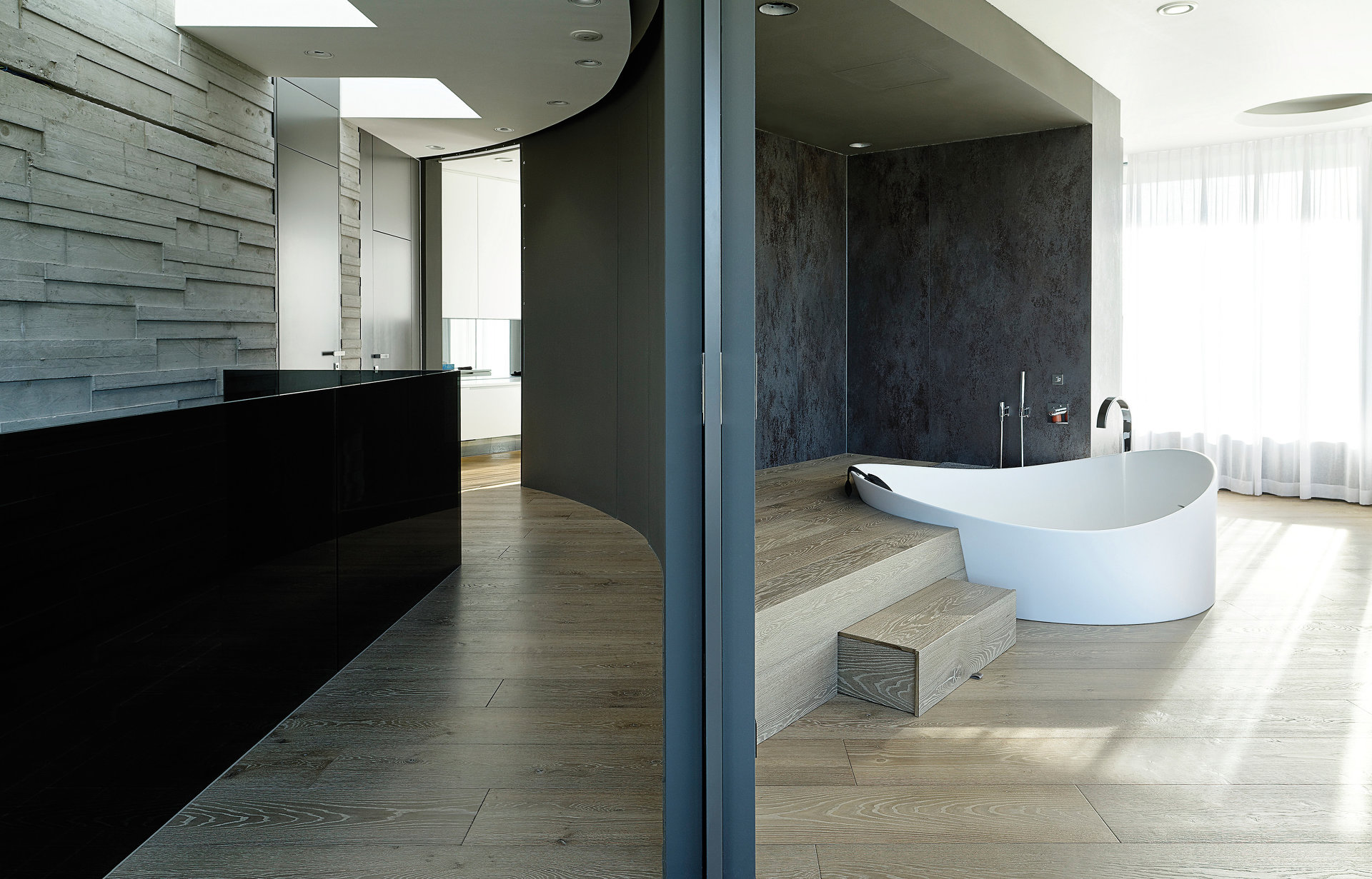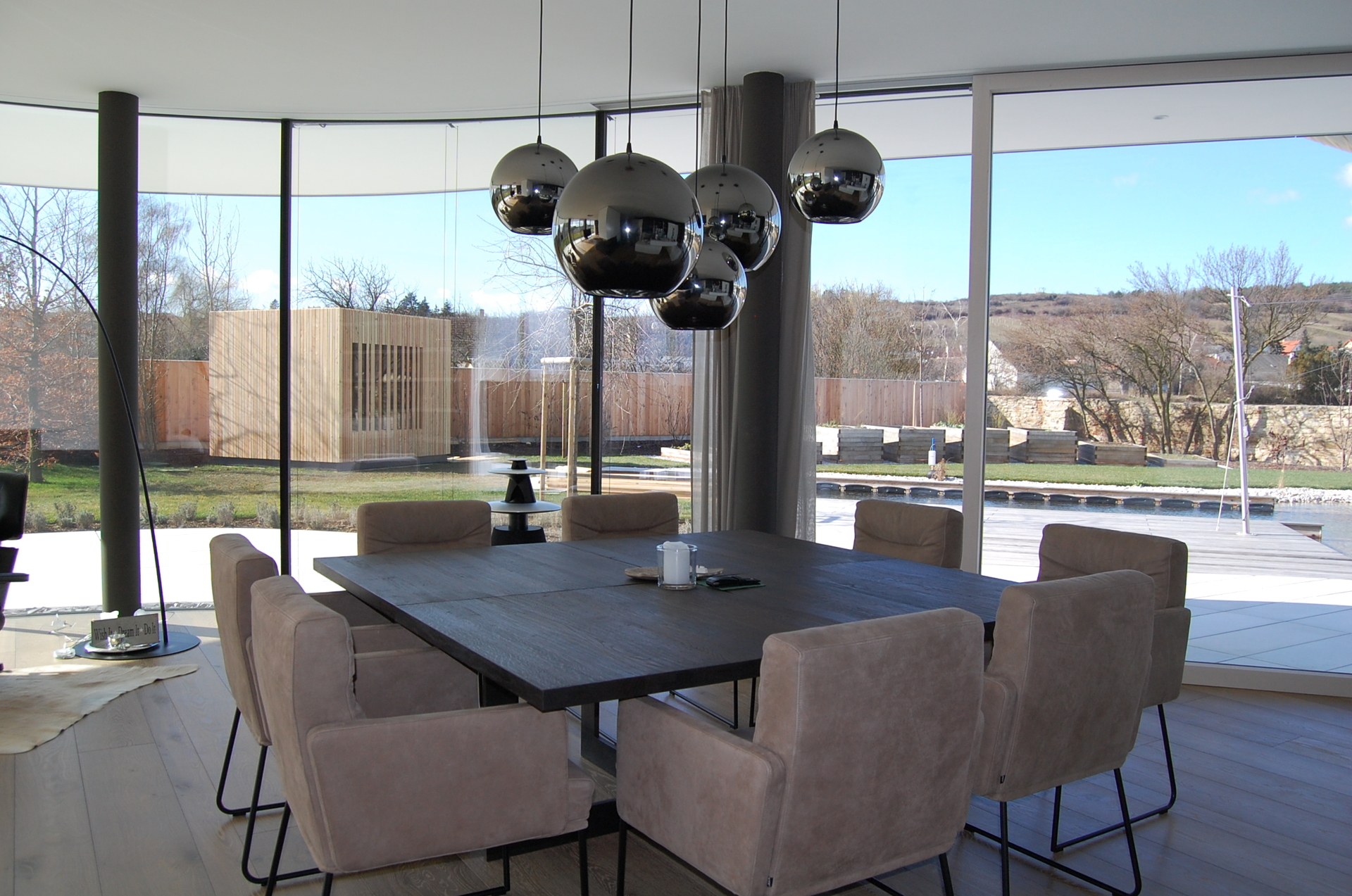 Die Gestaltung der Fassaden ist durch die großzügige Verwendung von raumhohen Glas-Elementen charakterisiert. Ein konisch-asymmetrischer Grundriss mit teilweise abgerundeten Ecken und ein zurückspringendes Obergeschoß mit auskragenden Decken werden sonnen-, wind- und wettergeschützte Freiraum-Bereiche geschaffen.