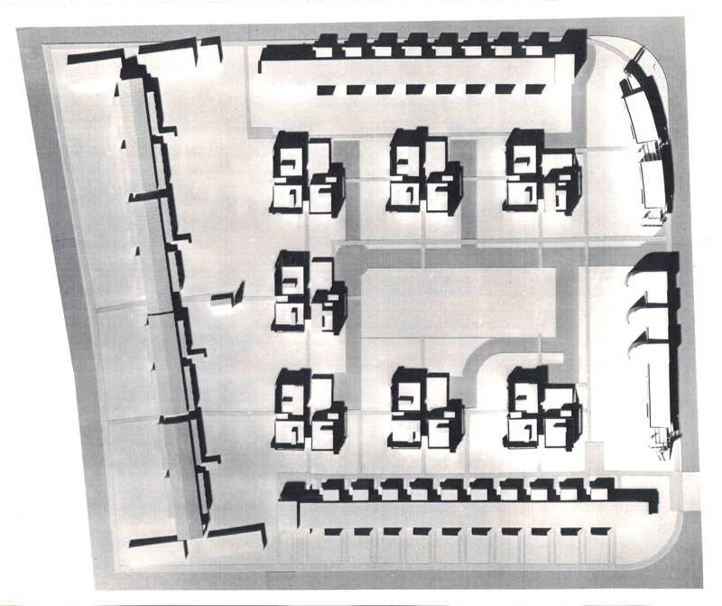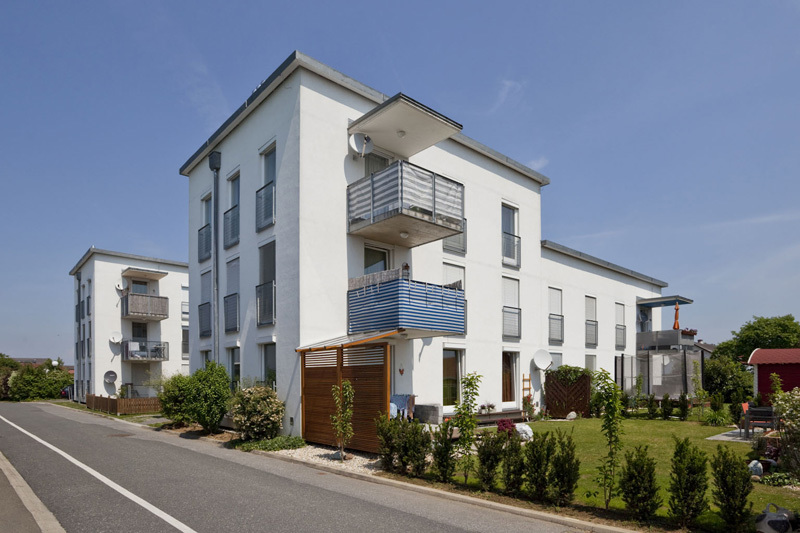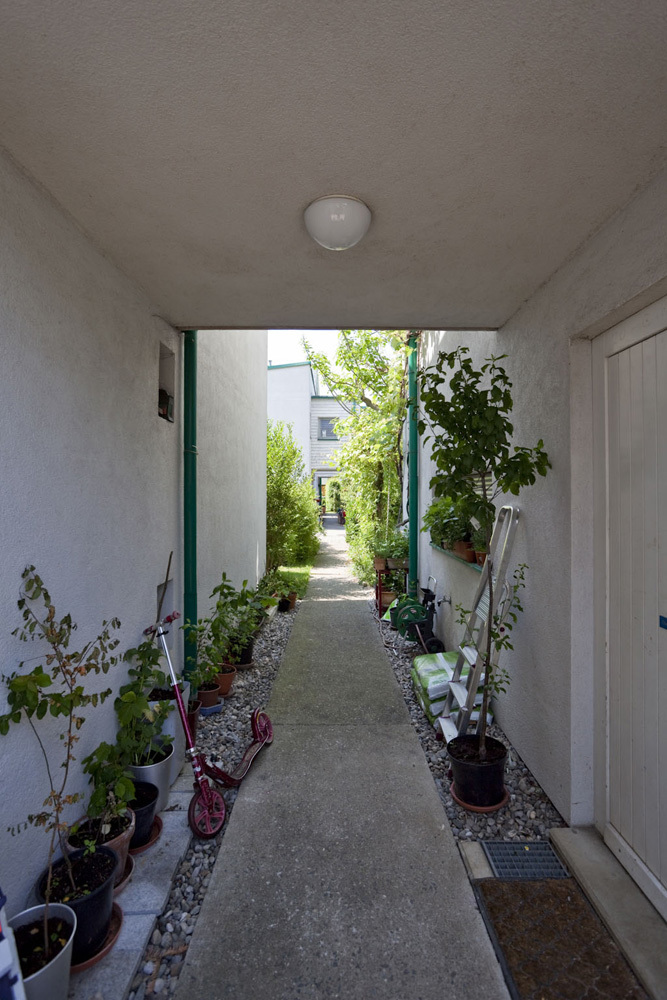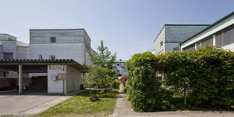 Die Grundstruktur bilden eine Randbebauung und kleinere Punkthäuser um einen großen, für alle Bewohner offenstehenden, begrünten Innenhof. Die von außen nach innen lockerer werdende Bebauung erzeugt eine Zentralität, die eine starke soziale Integration der Bewohner, ähnlich einem Dorfleben, zum Ziel hat. Die damit Hand in Hand gehende Abstufung der Freiräume von privat über halböffentlich zu öffentlich orientiert sich am Aufwachsen der Kinder, die zunächst im eigenen Garten spielen, dann mit den Kindern der direkten Nachbarn und schließlich in der größeren Gruppe am Spielplatz im Zentrum der Anlage. Die differenzierten Baukörper rund um den Hof kultivieren das soziale Zusammenleben der Gemeinschaft mit einer einem Einfamilienhaus entsprechenden Wohnqualität, jedoch bei weitaus besserer Grundstücksausnutzung. Die geringe Fluktuation unter den Bewohnern und deren hohe Zufriedenheit zeigen, dass verdichteter Wohnbau auch außerhalb der Stadt angenommen wird und daher weiter forciert werden sollte.