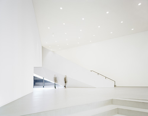 Ohne Schriftzug und ohne Pomp und Trara findet man mühelos den Weg ins Foyer. Die Architektur - und da würde sich Adorno wahrscheinlich gelangweilt abwenden - spricht eine klare und unmissverständliche Sprache. Nach 43 Stufen hat man das Innere erreicht: weiße Wände, heller Boden, dramatische Geometrie in allen Dimensionen. Hier kommen Delugan und Meissl so richtig auf Hochtouren und setzen die ihnen innewohnende Raumflussidee wie aus dem Effeff in die Realität um.