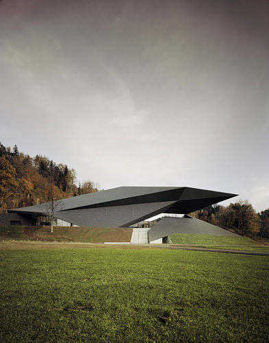 „Das alte Passionsspielhaus von Schuller scheint sich mit seinen weichen Formen in den Berg hineinzudrehen“, erklärt Sebastian Brunke, Projektleiter bei DMAA. „Unser Bau arbeitet auch mit dem Hang, bricht jedoch eher aus dem Bergmassiv heraus.“ Besonders stolz ist man auf das Farbspiel zwischen Schwarz und Weiß: „Es ist ein kontextualisiertes Spiel mit den Jahreszeiten“, so Brunke. „Im Sommer ist es das Passionsspielhaus, das aus der Landschaft hervorsticht, während das Winterhaus unauffällig vor dem dunklen Wald verschwindet. Im Winter, wenn der Schnee liegt, ist es umgekehrt.“