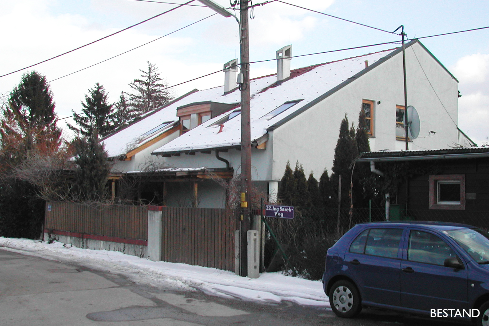 Über die gesamte Gebäudelänge hinweg wurde das Dach auf einer Seite angehoben und ein neuer Baukörper, der sich optisch und systematisch vom Altbestand abhebt und unterscheidet, seitlich in das Haus „geschoben“. Im Gebäude bietet der Dachausbau eine verbesserte Funktionalität. Ein großzügiges Badezimmer und der Wohn- und Arbeitsraum im ersten Stock ergänzen das Raumangebot im Kleingartenhaus. Die einheitliche Materialwahl – für die Fassade des Dachausbaues sowie des Balkons wurden Eternit-Großformattafeln eingesetzt – verstärkt die Eigenständigkeit des neu geformten Körpers und macht ihn als solchen ablesbar.