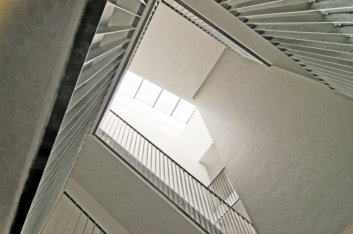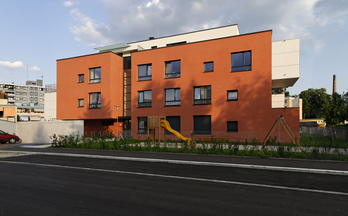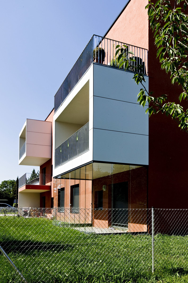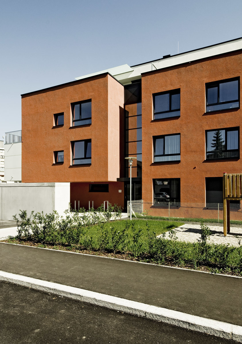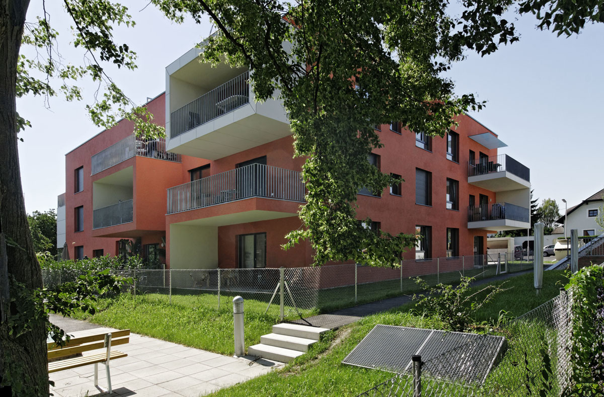 Die insgesamt 15 Wohnungen sind in einem 3- geschossigen kompakten Gebäude mit zurückgesetztem Dachgeschoss untergebracht. Der Baukörper entwickelt sich mit seiner Trakttiefe schneckenförmig entlang der Baufluchtlinie vom Eingang bis ins Dachgeschoss. In der Mitte entsteht ein zentrales, von oben belichtetes Stiegenhaus mit freistehendem Liftkern. Alle Wohnungen verfügen über großzügige Freiflächen wie Eigengärten, Balkone, Loggien und Dachterrassen. Die 5 Maisonette- Wohnungen im 2. Obergeschoss und im Dachgeschoss sind ineinander verschränkt angeordnet und orientieren sich mit ihren Aufenthaltsräumen jeweils nach zwei verschiedenen Himmelsrichtungen. Die Studios mit Dachterrasse im Dachgeschoss erlauben vielfältige, attraktive Nutzungsmöglichkeiten wie Wohnen, Arbeiten, Schlafen oder als Jugendzimmer.