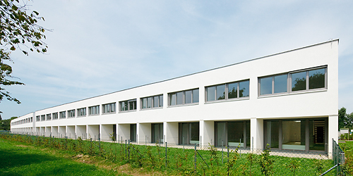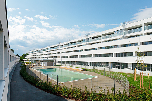 Die geringe Höhe der zweigeschossigen Reihenhauszeilen an der südlichen Grundgrenze und die konsequente Staffelung des nördlich gelegenen, fünfgeschossigen Terrassenhauses gewährleisten eine optimale Besonnung und Ausblick.