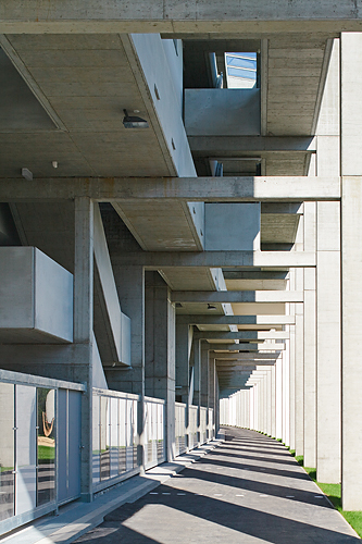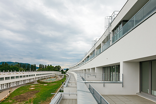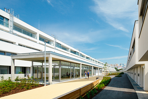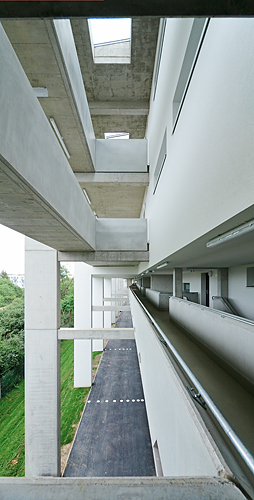 Gedeckte Freitreppen, Laubengänge und sechs Aufzüge bieten vielfältige Erschließungswege für die Geschosswohnungen. Über die gesamte Gebäudelänge befindet sich nordseitig eine gedeckte, private „Servicestraße“ für den Radverkehr, Müllabfuhr, Einsatzfahrzeuge und kontrollierten Liefer- bzw. Übersiedelungsverkehr. Eine exklusive Gehwegzone dient der Erschließung aller im Erdgeschoss befindlichen Allgemeinräume (Waschküchen, Müllräume, Kinderwagen- und Fahrradabstellräume). Im Kellergeschoss sind an der Erschließungsachse die Einlagerungsräume und zusätzliche Winterräume für Fahrräder und Kinderwägen über Erschließungswege mit „Tageslichtbrunnen“ angelagert.
