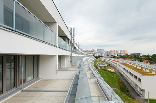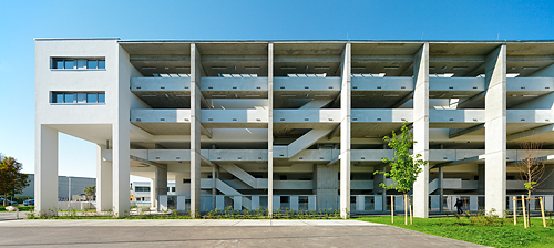 Im additiven Schottenraster von 7,20 m wird ein kompakter, südorientierter 2-Zimmer-Grundtyp angeboten. In Fortsetzung des wirtschaftlichen Achsrasters wird mit der Anbindung eines Schaltzimmers auf nunmehr 10,80 m Südfront zu einem 3-Zimmer-Grundtyp. Der so im Regelgeschoss entwickelte Wohnungsschlüssel wird aus wirtschaftlichen Gründen über alle fünf Terrassengeschosse, ohne Veränderung der vertikalen Schottenablastung weitergeführt.