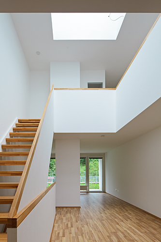In den beiden obersten Geschossen vergrößert sich der 2-Zimmer-Grundtyp über die Erschließungshalle Richtung Norden zu kompakten 4-Zimmer-Wohnungen mit Terrassen und Loggien. Zum Anger orientierte Gartenhöfe der Erdgeschosswohnungen komplettieren das Angebot „grüner Zimmer“ mit Anger- und Fernblick für alle Wohnungen. Alle Aufenthaltsräume, inklusive der durchgesteckten Wohnküchen, sind daher ausschließlich nach Süden orientiert. Besonderen Wohnwert bilden dabei auf 4 m Tiefe durchgängig vorgelagerte Terrassen mit inkludierten Loggienübergängen von 25–40 m².