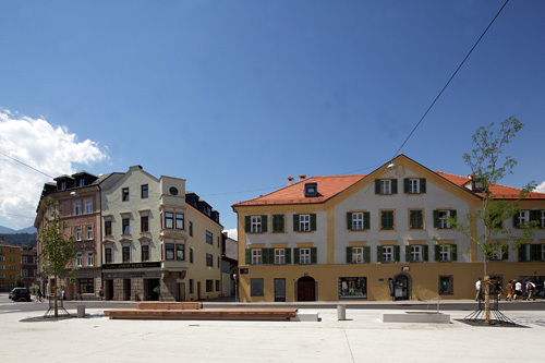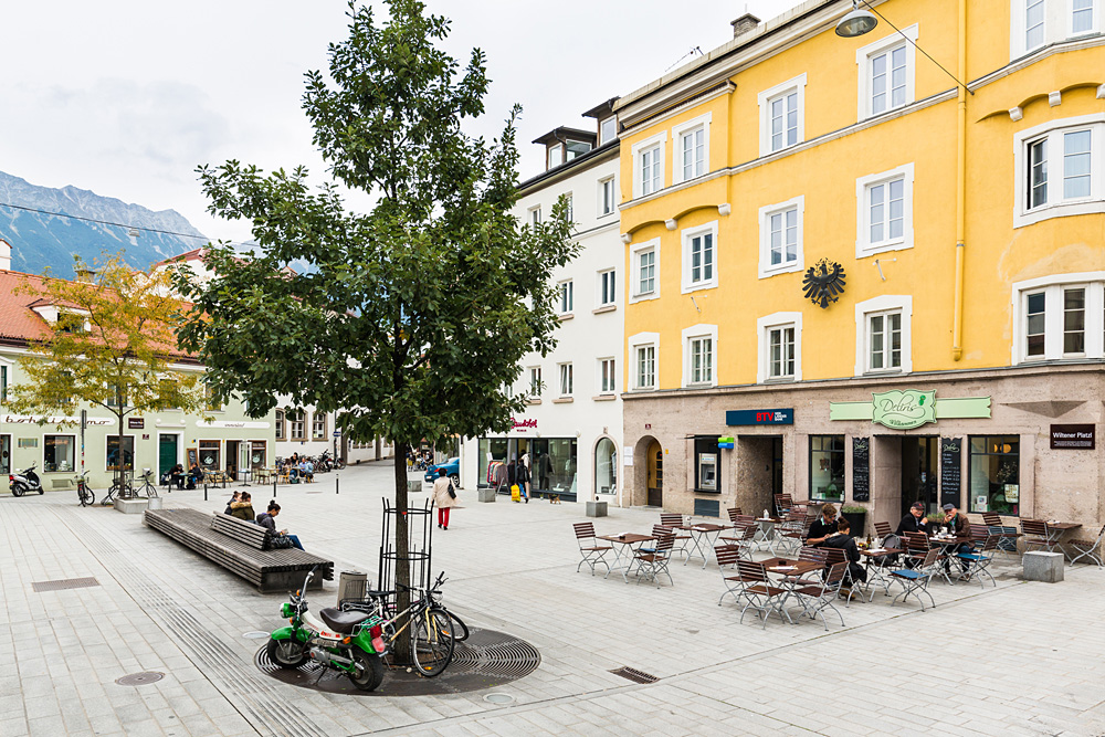 Entlang der Leopoldstraße – der Verlängerung der Maria-Theresien-Straße Richtung Süden – liegen das Wiltener Platzl und etwas südlicher auf der anderen Straßenseite der Kaiserschützenplatz. Der Bereich rund um die beiden Plätze war als „Wiltener Unterdorf“ einer der Siedlungskerne des Dorfs Wilten. Noch heute zeugt die klein strukturierte, gewachsene Bausubstanz von dieser dörflich-mittelalterlichen Vergangenheit, die beiden Plätze verkamen allerdings zuletzt als Parkplatz bzw. begrünte Verkehrsinsel zu reinen Verkehrs(rest)flächen. Ausgehend von einem Bürgerbeteiligungsprozess 2005, bei dem Anrainer:innen und ansässige Kaufleute ihre Wünsche und Ziele formulierten, wurde Manfred Gstottbauer mit einer Studie zur Revitalisierung dieses urbanen Subzentrums und der gestalterischen Adaptierung der beiden Plätze beauftragt.In einer ersten Baustufe wurde das Wiltener Platzl mit wenigen Eingriffen zu einem lebendigen und attraktiven Stadtteilplatz transformiert. Der Platz erhielt ein einheitliches Niveau und eine durchgängige Oberfläche aus Hartberger Granit, die als heller Steinteppich den Platz großzügig erscheinen lässt. Eine lang gezogene zentrale Sitzbank mit Trinkbrunnen, zwei Bäume und Sitzmöglichkeiten aus Granitblöcken strukturieren den Platzraum und laden zum konsumfreien Verweilen ein. Die offene, nutzungsneutrale Gestaltung und die zur Verfügung gestellte Infrastruktur (Strom und Wasser) machen es möglich, dass der Platz flexibel bespielbar ist – vom wöchentlichen Bauernmarkt bis zu kleineren Konzerten und Events. Besonders erfreulich ist, dass im Zug der Neugestaltung auch die Anrainer investierten, Häuser renoviert wurden und Lokale mit kleinen Gastgärten den Platz beleben. (Text: Claudia Wedekind)