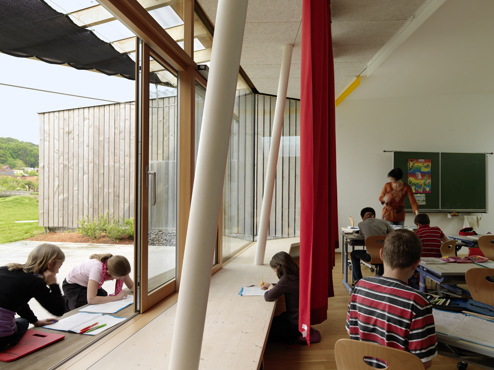 Es ist ein offener Bereich, der der Erkenntnis Rechnung trägt, dass Kinder Laufen, Springen und Toben brauchen, um dann wieder konzentriert und kreativ arbeiten zu können. Rampe, Sitzstufen und Bücherinseln gliedern diesen offenen Raum, eine tiefe Lesenische ist intimer Rückzugsraum auf zwei Ebenen. Jedes Detail ist sorgfältig geplant und erfüllt mehr als eine Funktion: die Verglasung vom Klassen- zum Pausenraum ist Durchblick und zugleich Sitzbank, die niedrigen Parapete der Klassen sind Sitz- und Arbeitsfläche, Ablage und Stauraum. Klassentrennwand und Fassade sind jeweils polygonal geknickt. Immer wieder, an vielen Stellen, brechen Feyferlik und Fritzer die Strenge der Orthogonalität, die für sie Symbol einer antiquierten Schulform mit Frontalunterricht ist. Ihre Klassen können über Verbindungstüren zusammengeschaltet werden, und jeder ist eine Freiluftklasse vorgelagert. Eine wind- und teils regengeschützte Terrasse, über Glas und ein breites Schiebeelement mit dem Innenraum verbunden, soll zum Unterricht im Grünen motivieren.