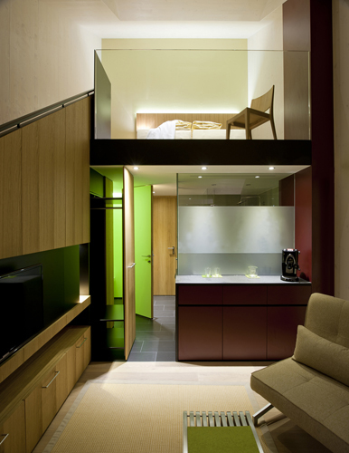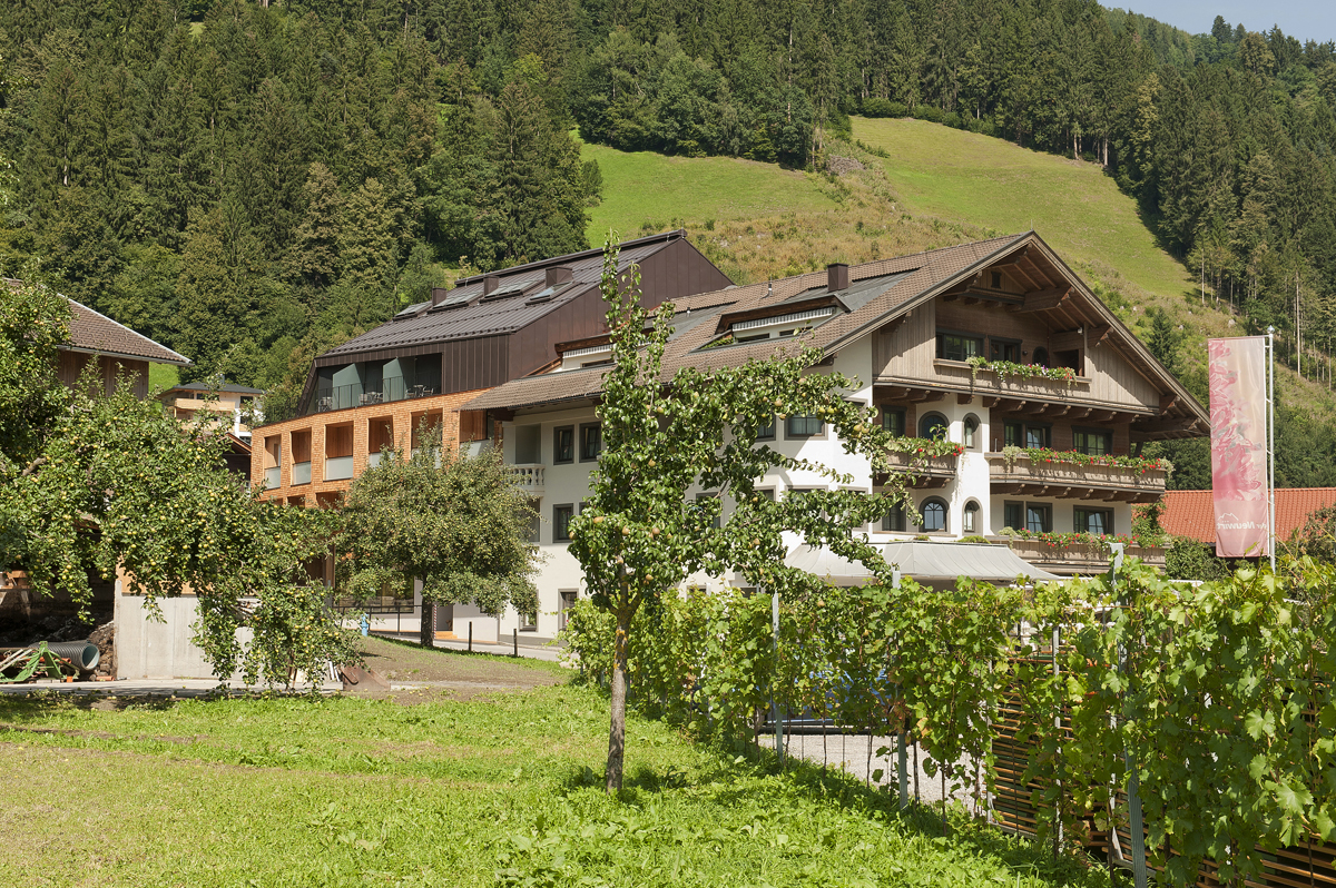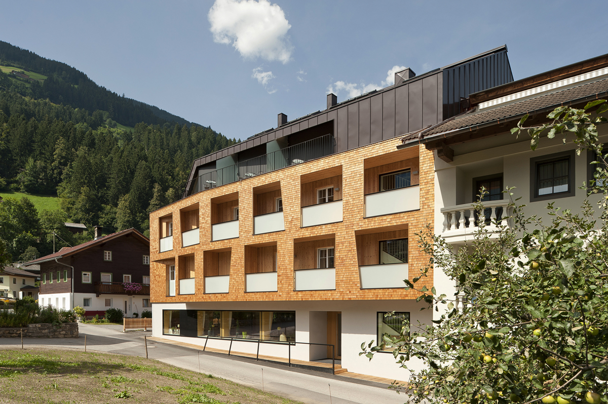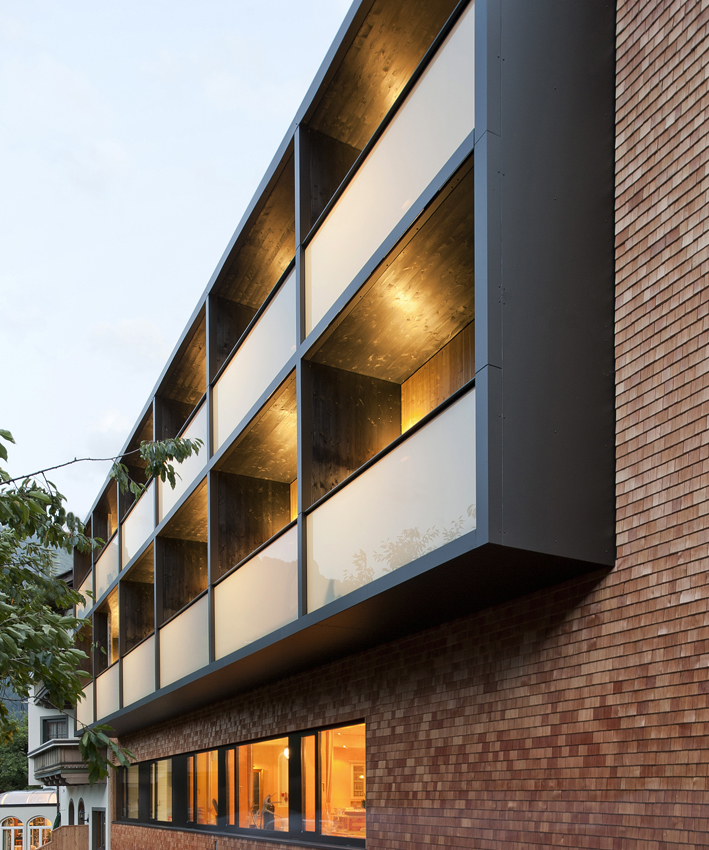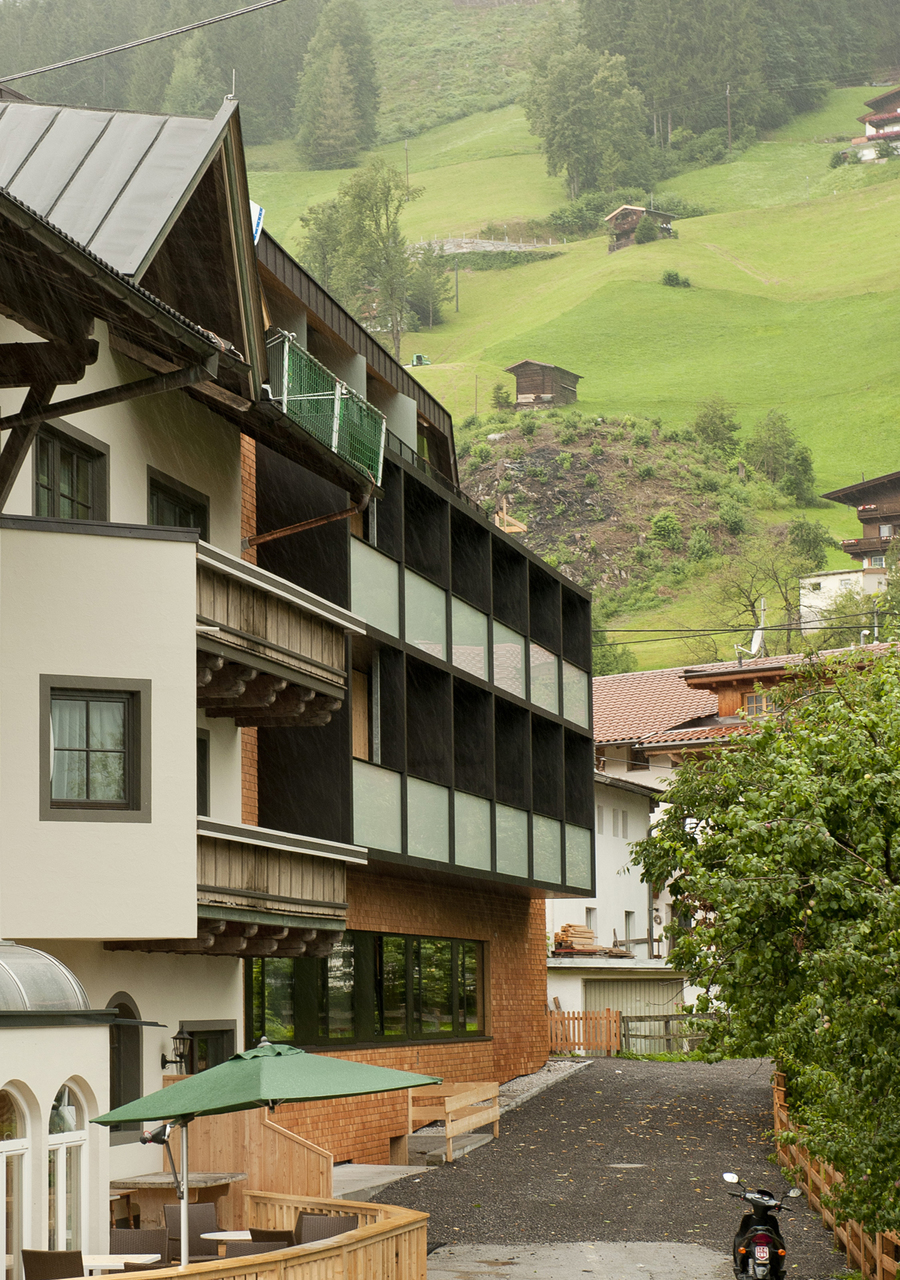 Dazu wurde der bestehende Dachstuhl des westlichen Bauteils ab der Decke über dem 2. Obergeschoss komplett abgetragen sowie sämtliche Balkone an der Nord-, West-, und Südseite entfernt. Im neuen Dachaufbau, dessen Form sich am Altbestand orientiert bzw. aufgrund der durch die Abstandsregelung definierten Vorgaben entwickelt wurde, entstanden sieben zweigeschossige Apartments mit vorgelagerten Terrassen. Mit einem großzügigen, hohen Wohnbereich und einer Schlafebene unter dem Dach bieten die sogenannten „Adlersuiten“ dem Gast exklusiven Wohnraum auf zwei Ebenen. Im 1. und 2. Obergeschoss wurden die bestehenden Zimmer renoviert und mit neuen Balkonen ausgestattet. Dazu wurde im Süden eine durchgehende Balkonzone als Holzkonstruktion vorgesetzt und im Norden konstruktiv zu einem Element zusammengefasste Balkone errichtet. Die gesamte Bestandsfassade des umgebauten Baukörpers wurde zur thermischen Verbesserung der Gebäudehülle wärmegedämmt und mit einer Schindelfassade umhüllt. Die einheitlich und in klarer Formensprache gestaltete Fassade trägt zur Beruhigung des Gesamtkomplexes bei und vermittelt nach Außen die Neuorientierung des Hotels. (Text: Claudia Wedekind)