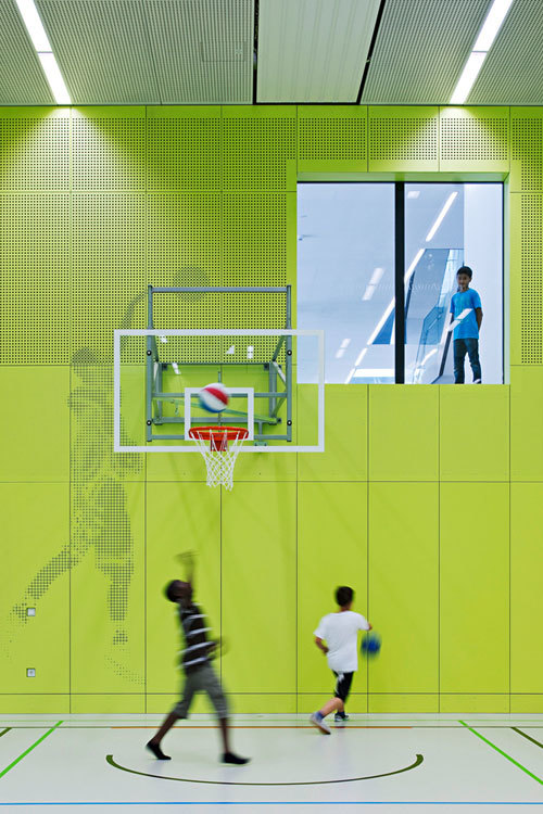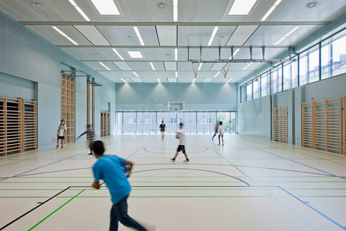 Eine zentrale Qualität war auch die hochwertige Ausformulierung der räumlich begrenzten Freibereiche, um trotz hoher Nutzungsfrequenz (400 Schüler) einen differenzierten, robusten und angenehmen Freiraum zu schaffen. So werden als Ergänzung zu den Turnsälen im Innenhof die für die innerstädtische Lage so wichtigen Spiel- und Bewegungsflächen (Sportbelag, Street Ball, Klettergerüst) angeboten. Weiters wurde die straßenseitige Vorzone nicht als Abstandsgrün, sondern als niederschwelliger Treffpunkt für Schüler und lokaler Bevölkerung mit entspannten Aufenthaltsqualitäten ausformuliert (Platzerl, Sitzbänke, Bepflanzung).