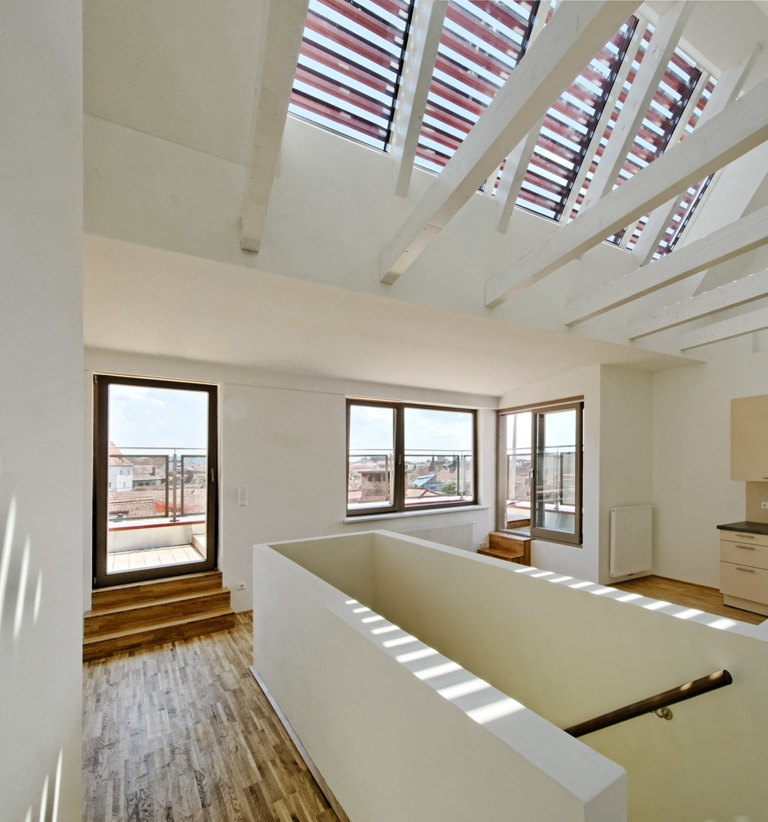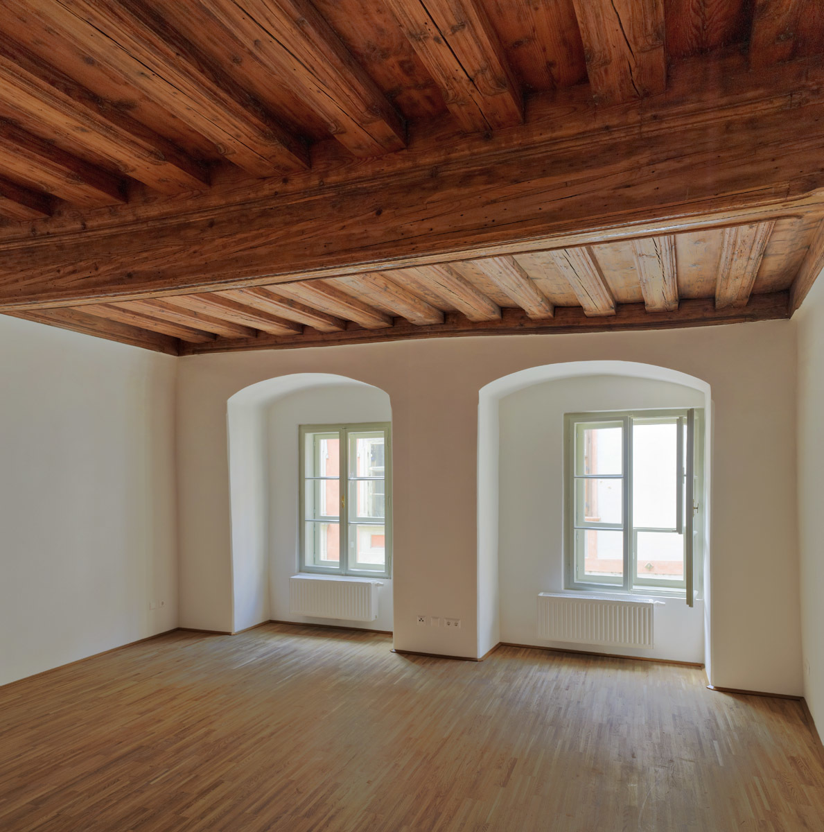 Die Revitalisierung des „Strehly-Hauses“ richtet sich mit Wohnungsgrößen zwischen 30 und 90 m² vor allem an junge Menschen und „Rückkehrer“ in die Stadt. Obwohl auf dem Papier „nur“ den Standards des sozialen Wohnbaus entsprechend, bieten die Wohnungen atmosphärische Qualitäten, die in einem Neubau nie erreicht werden können. Die Räume beinhalten die Struktur und damit alle Eigenheiten des Bestandes. Individuelle Lösungen lassen abwechslungsreiche und spannende Innenräume entstehen: Stark variierende Raumhöhen, teilweise ziemlich schräge Holz-Riemendecken aus der Renaissance und schiefwinkelige Verschneidungen geben jedem Raum einen einzigartigen Charakter. Raffinierte Details wie die schrägen Unter- und Oberkanten der Gaube, die sich am Gefälle der Sporgasse orientieren, fügen sich wie von selbst in dieses Umfeld.