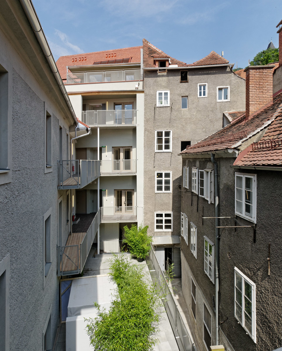 Die Grundrisse sind über die volle Tiefe von 20 Metern durchgesteckt und verwandeln die Wohnungen mit der meist mittig positionierten Sanitärbox in „Mikro-Lofts“ mit einer Belichtung und Belüftung von beiden Seiten. Dafür wurde zusätzlich zum renovierten Arkadenhof, in dem historische Säulen freigelegt wurden, ein neuer Lichthof herausgebrochen. Der ursprünglich mittelalterliche Bestand hielt auch für die Statiker eine Überraschung bereit: Während der Bauarbeiten wurde entdeckt, dass sich die Häuser der Sporgasse gegenseitig abstützen und damit auch konstruktiv nicht völlig isoliert von ihren Nachbarn betrachtet werden können. Die Erschließung geschieht über ein offenes Stiegenhaus und Laubengänge, der Hof auf dem Niveau des ersten Obergeschoßes bietet sich als Kommunikationsraum für die Bewohner an.